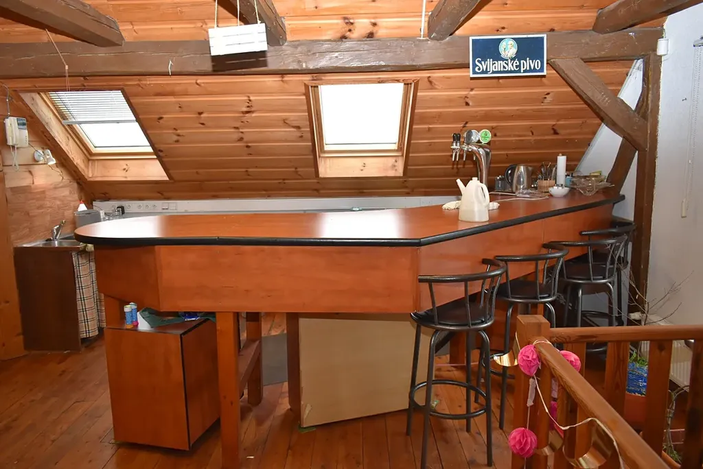 V patře se nachází stylová místnost s barem a kuchynkou. Zde se dají točit různé nápoje a připravovat různé dobroty. Je zde i mistnost pro ruzné hry a WC dámské a pánské. Součástí je i galerie s pěkným výhledem na oslavence.