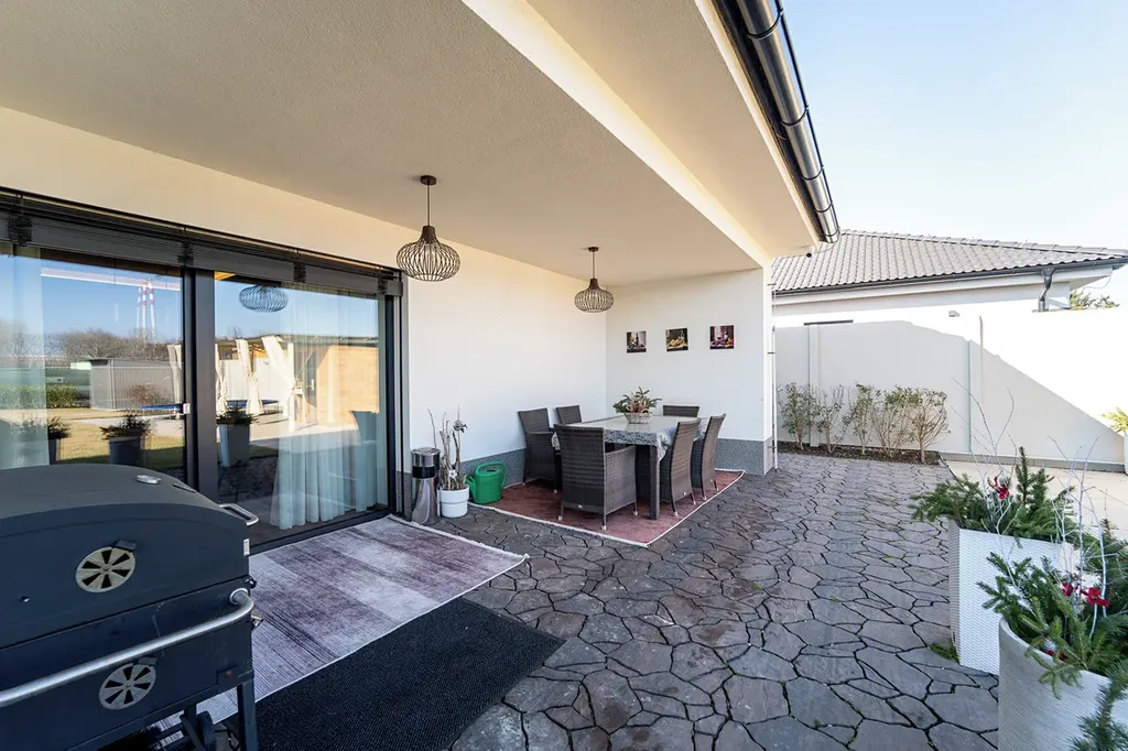 Jednotka byla dokončena v roce 2022 a nabízí prakticky řešenou dispozici o užitné ploše 91,7 m². Interiér domu působí velmi vkusně a moderně, s důrazem na pohodlí každodenního bydlení. O tepelný komfort se stará podlahové vytápění, které zajišťuje příjemnou atmosféru v celém domě.