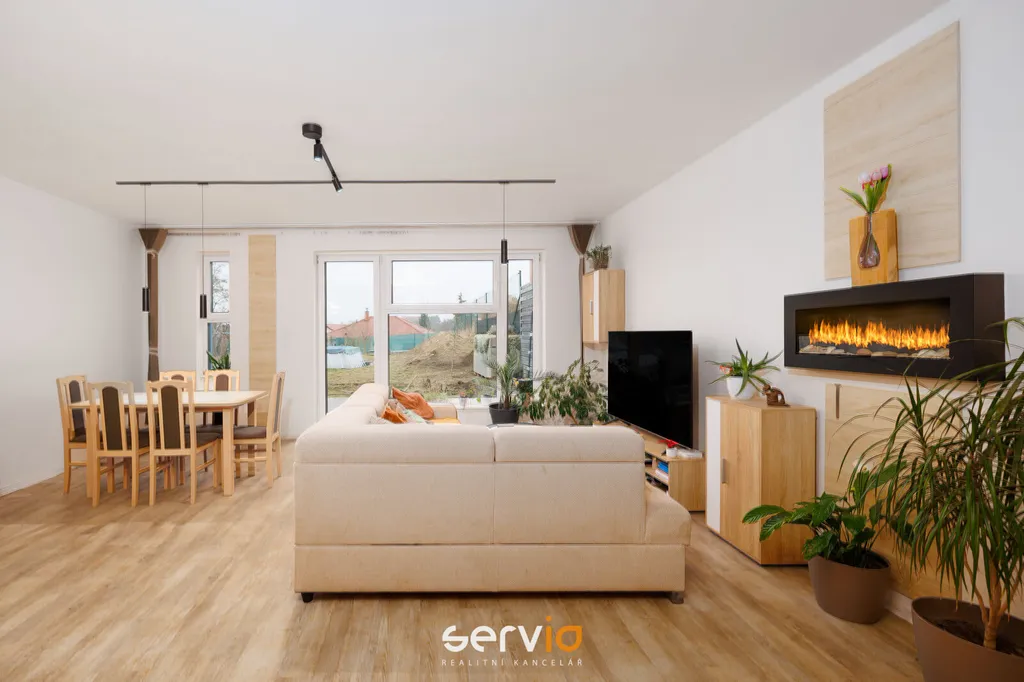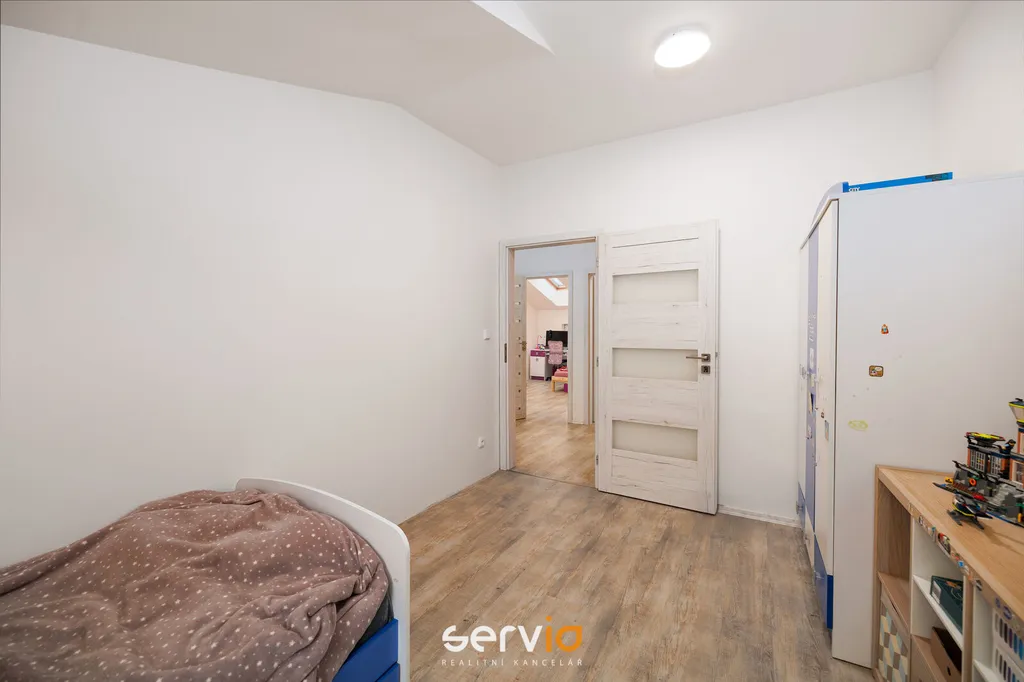 Jedná se o patrový dům o 2.NP v blokové zástavbě rodinných domů mimo hlavní ulici. V přízemí se nachází obývací pokoj s kuchyňským koutem, vstupem na zahradu s terasou, pracovna a WC. V patře zbývající 4 pokoje a koupelna s vanou a WC. Možnost parkovaní na vlastním pozemku až pro 3 auta, z toho 1 kryté za uzamykatelnou bránou.