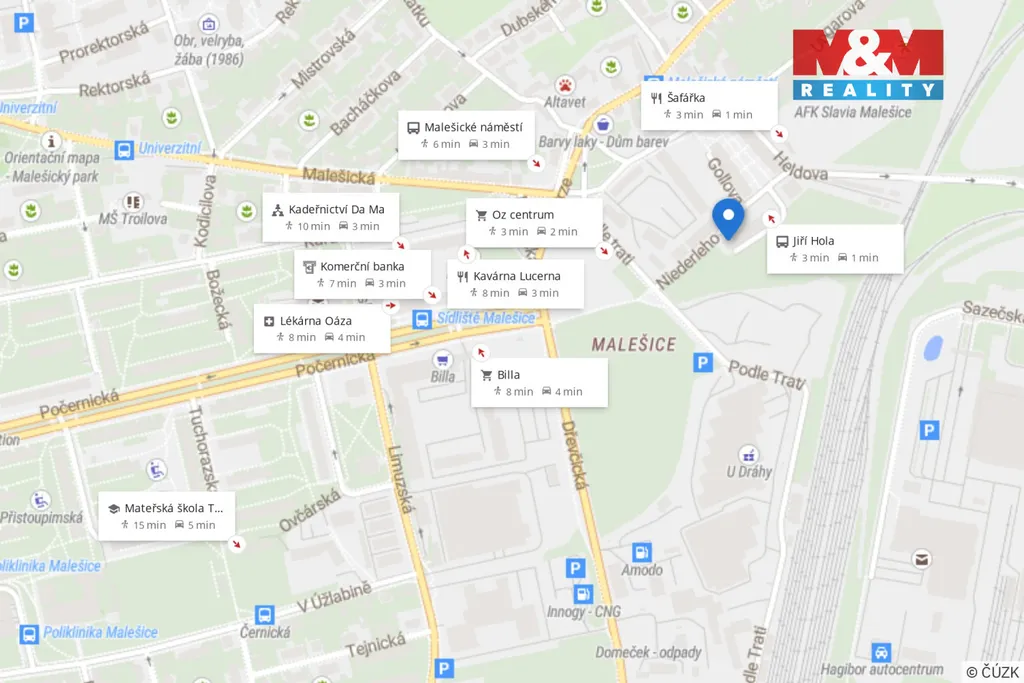 Díky slepé ulici je zde minimální provoz. Jen pár minut chůze vás dělí od Malešického parku a Botanické zahrady.