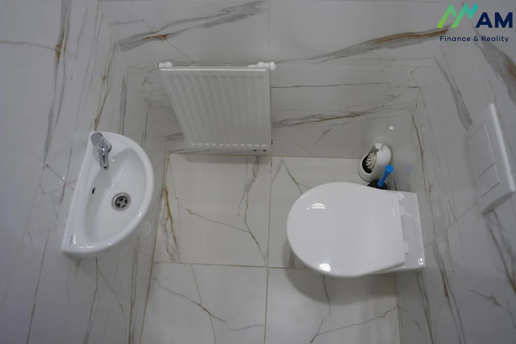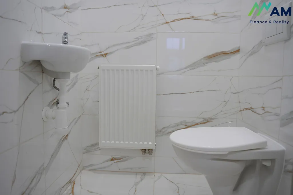 Koupelna nabízí komfortní sprchový kout a praktické umyvadlo se stylovou skříňkou pro dostatek úložného prostoru, přičemž toaleta je řešena samostatně pro maximální soukromí. Velkým plusem je prostorná technická místnost, která poskytuje ideální zázemí pro umístění pračky i sušičky, čímž efektivně využijete každý metr čtvereční. Ložnice pak nabízí další benefit v podobě samostatné šatny, která zajistí přehledné uspořádání vašeho šatníku.