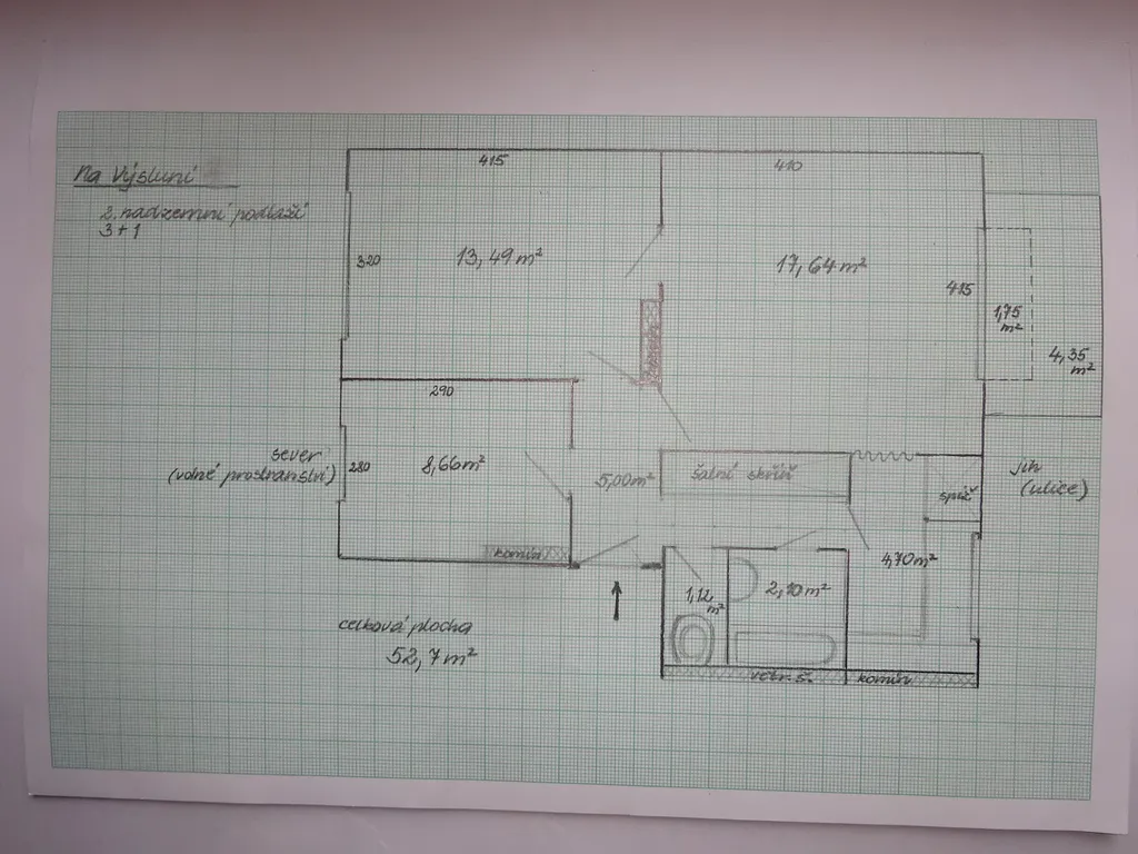 Zděný, slunný byt 3+1, situovaný v 1. patře bytového domu (bez výtahu). Podlahová plocha bytu 52,71 m² (pokoj 13,49 m²; pokoj 8,66 m²; pokoj 17,64 m² s balkonem 1,75 m²; chodba 5,00 m² se šatní skříní; kuchyň 4,70 m²; koupelna 2,10 m²; WC 1,12 m²). V suterénu jsou dva sklepy 3,12 a 3 m²; společný sklep 4,6 m². Topení v bytě el. přímotopy (z r. 1995), dřevěná okna (z r. 2012), v koupelně je původní vana, umyvadlo a el. bojler (z r. 1985). Možnost instalace krbových kamen. Bylo by vhodné provést částečnou rekonstrukci a modernizaci bytové jednotky. V bytovém domě bude probíhat dokončení celkového zateplení celého domu včetně provedení nových balkonů (4,35 m²) - v ceně bytu je započítána částka ve výši 240tis. Kč na tuto rekonstrukci. Průkaz energetické náročnosti budovy je ve fázi rozpracovanosti (nový bude vyhotovený během dvou měsíců), nyní uvádíme energetickou třídu "G". Bytový je dům situovaný v klidné lokalitě města, s dobrou dostupností lokality Fajtův kopec, nedaleko k obchodnímu centru a autobusovému nádraží.