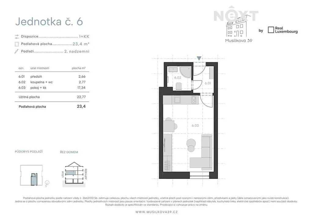 - Parametry: 1+kk, 23,4 m2 ve 2. nadzemním podlaží (1. patro).