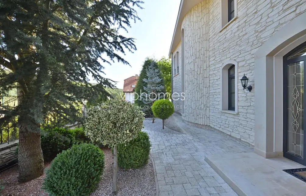 Velkoryse navržena moderní vila s krytým, vyhřívaným venkovním bazénem, saunou a rozsáhlou zahradou v sousedství přírodního parku Tichá Šárka a mezinárodní školy ISP v Nebušicích.