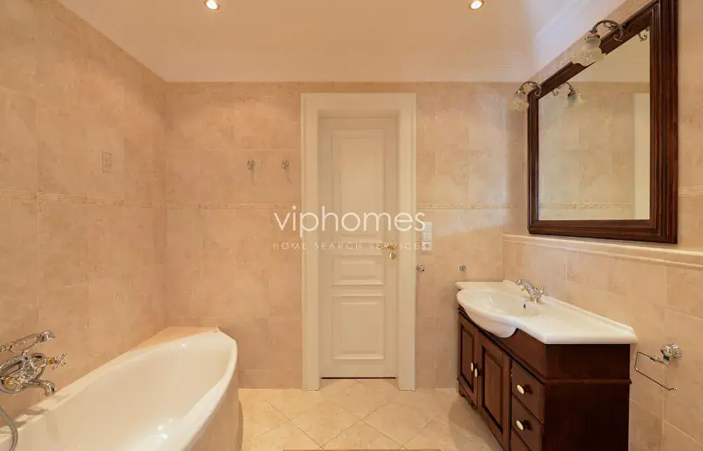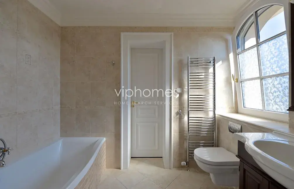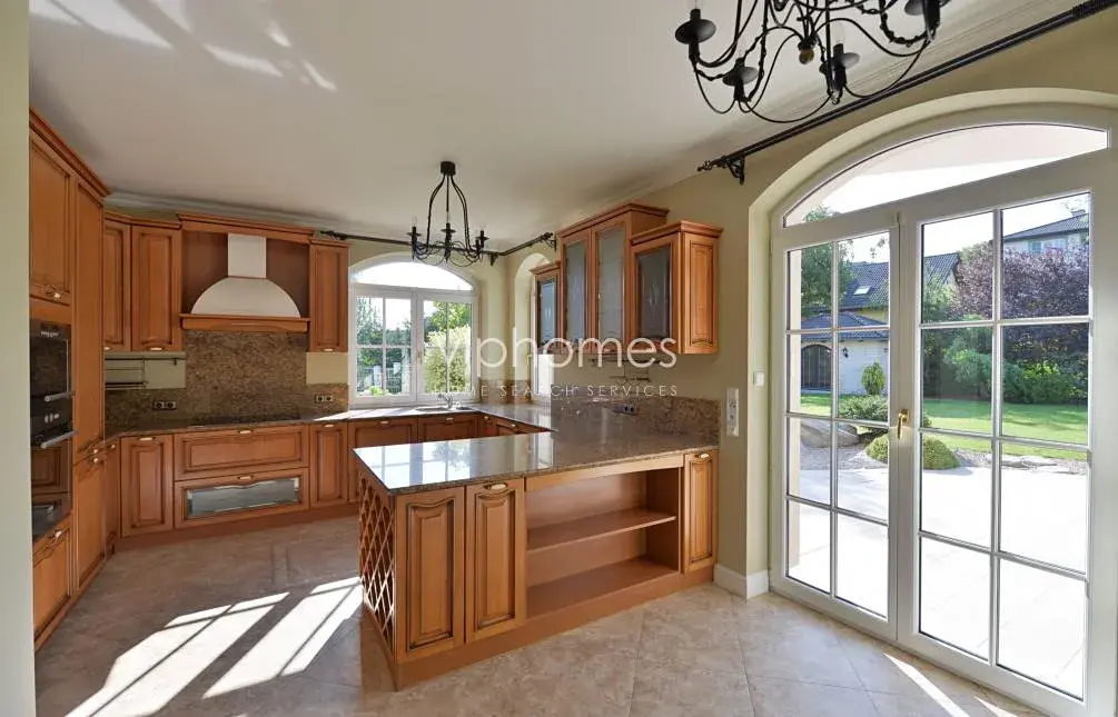 Hlavní obytný prostor v přízemí zahrnuje komfortní obývací pokoj s krbem, plně vybavenou kuchyň s jídelnou a spíží, dva pokoje s flexibilním využitím, koupelnu, samostatnou toaletu, technickou místnost. Na obývací pokoj navazuje venkovní terasa, klidný zahradní prostor s krytým vyhřívaným bazénem. V horním patře je umístěna centrální hala, 4 ložnice, 3 koupelny, 2 šatny, terasa, a technická místnost. Kuchyně je kompletně vybavena ( 2 lednice, teplovzdušná trouba, mikrovlnná trouba, myčka nádobí).