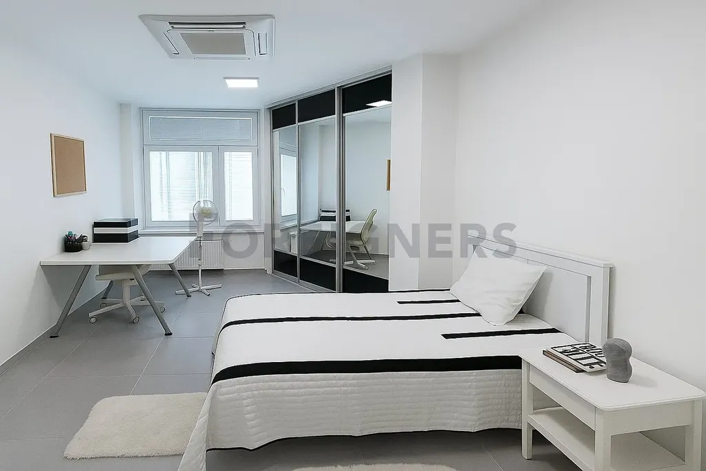 V bytě se nachází vstupní chodba, ze které se dostanete do obývacího pokoje s kuchyní. Dále pak samostatný pokoj s velkou postelí, skříni a pracovním stolem. V bytě je koupelna se sprchovým koutem a toaletou.