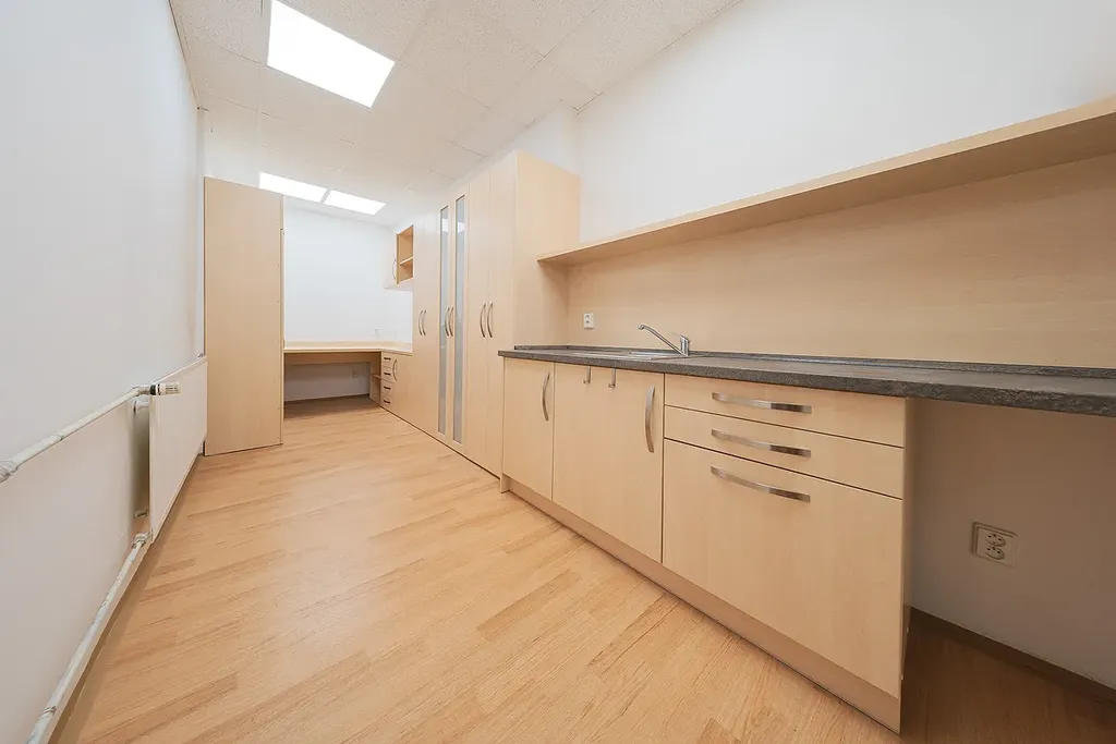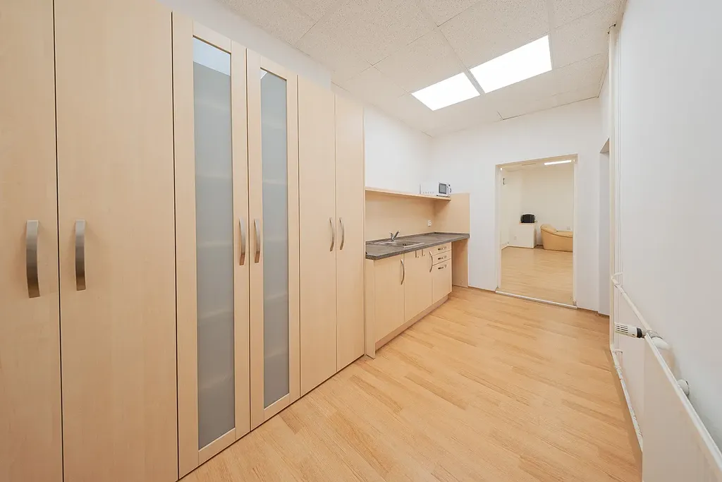 Součástí kanceláře je kuchyňka, WC je umístěno ve společných prostorách budovy.