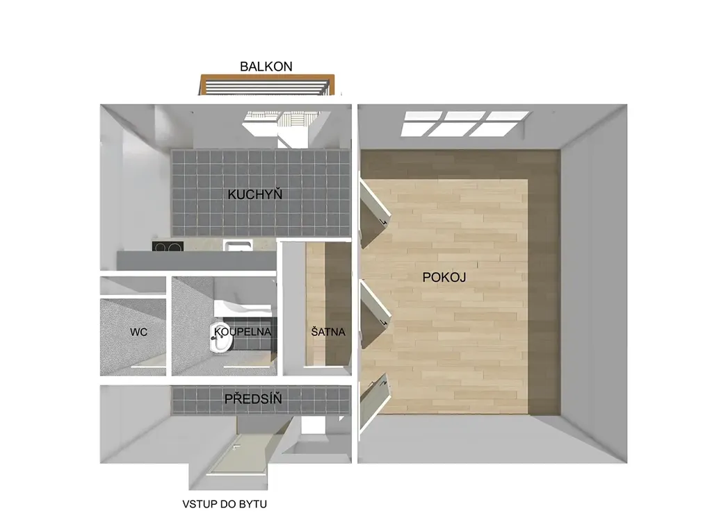 Byt se nachází v 5.NP bytového domu, má orientaci do ulice, sklep je k dispozici.