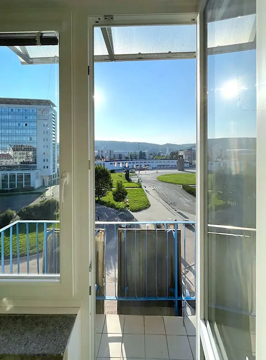Výhled z obývacího pokoje i kuchyně s balkonem je do klidné části ulice.