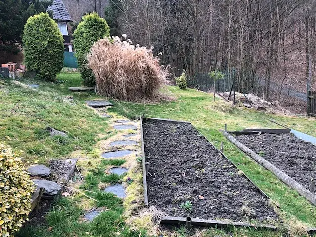 Na dům navazuje velká zahrada, která je rozdělena na dvě části, kde menší je spíše okrasná, se záhony zeleniny a květin, tu větší mohou spásat například ovce.
