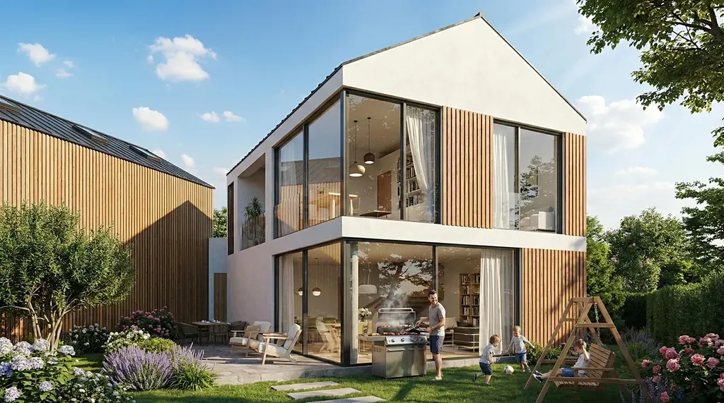 Domy jsou chytře rozmístěny ve hvězdicovém uspořádání, které zajišťuje klid, soukromí a bezpečné prostředí pro děti.