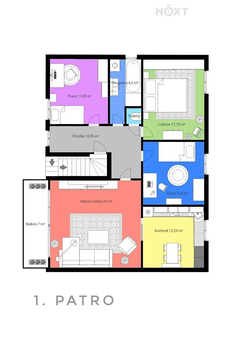 Druhé patro má výměru 97 m² a nabízí prostornou bytovou jednotku o dispozici 4+kk, která poskytuje komfortní bydlení pro větší rodinu.