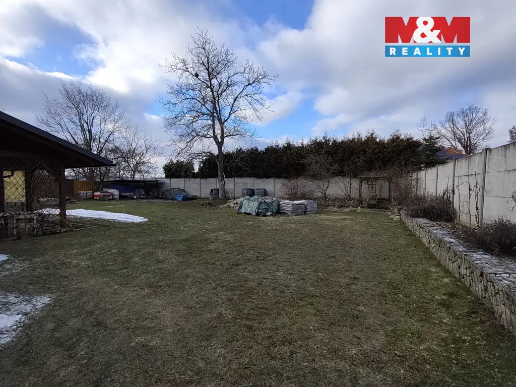Za domem je prostorná pergola a větší zahrada s podzemní nádrží na dešťovou vodu.