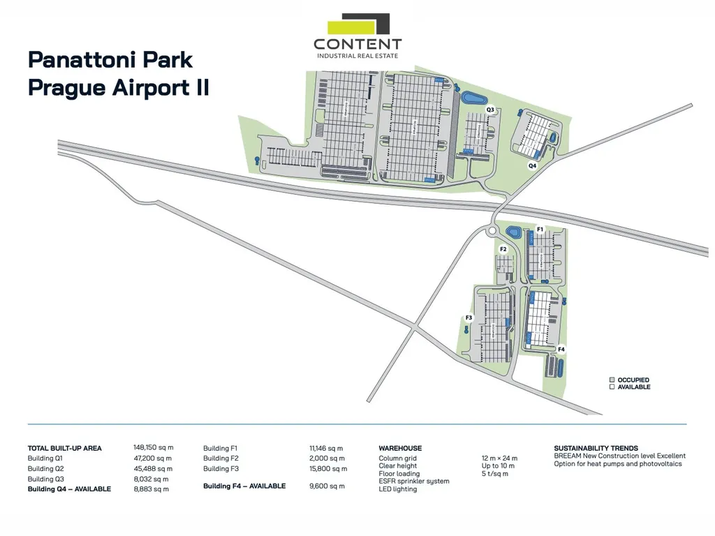 V zastoupení majitele a bez provize nabízíme samostatné industriální prostory o velikosti 9600 m², vhodné pro sklad nebo výrobu, umístěné v novém komerčním parku přímo u dálnice D6, EXIT 7.