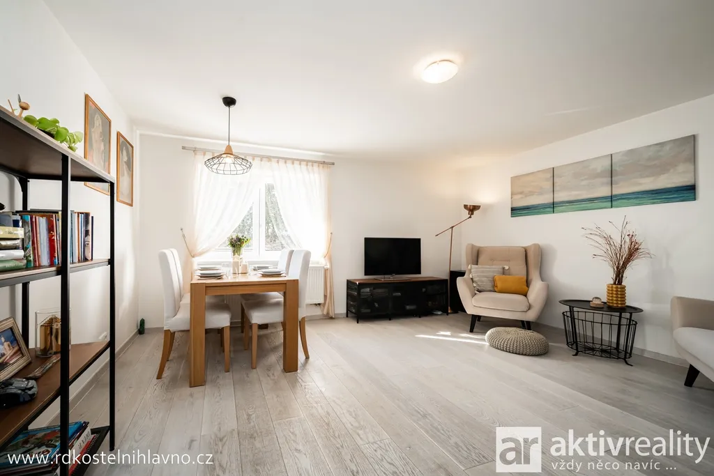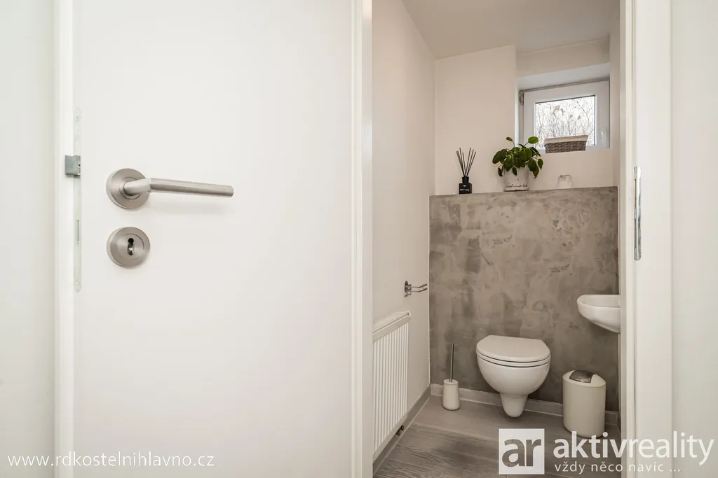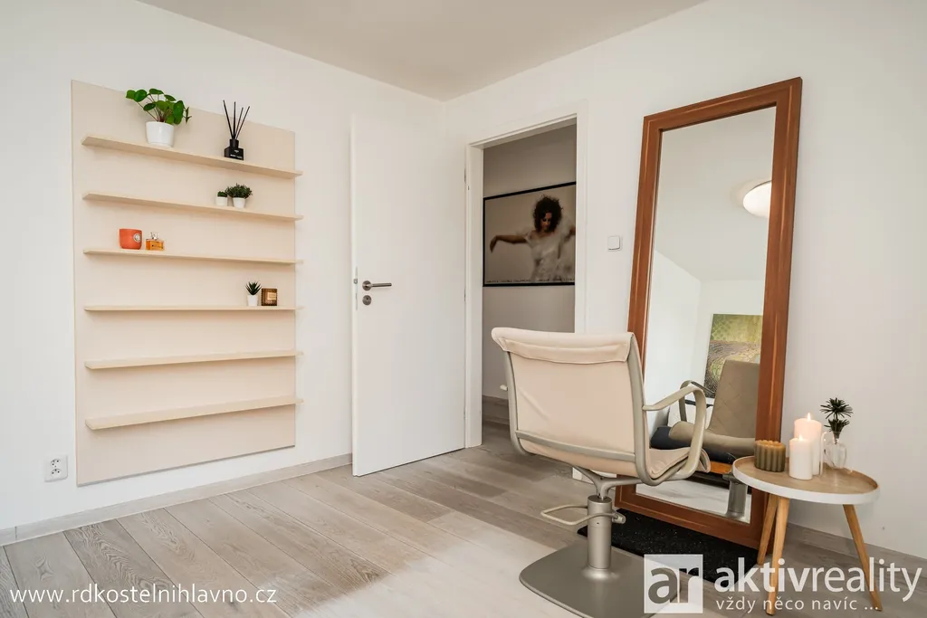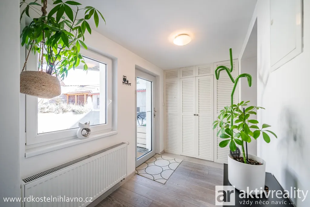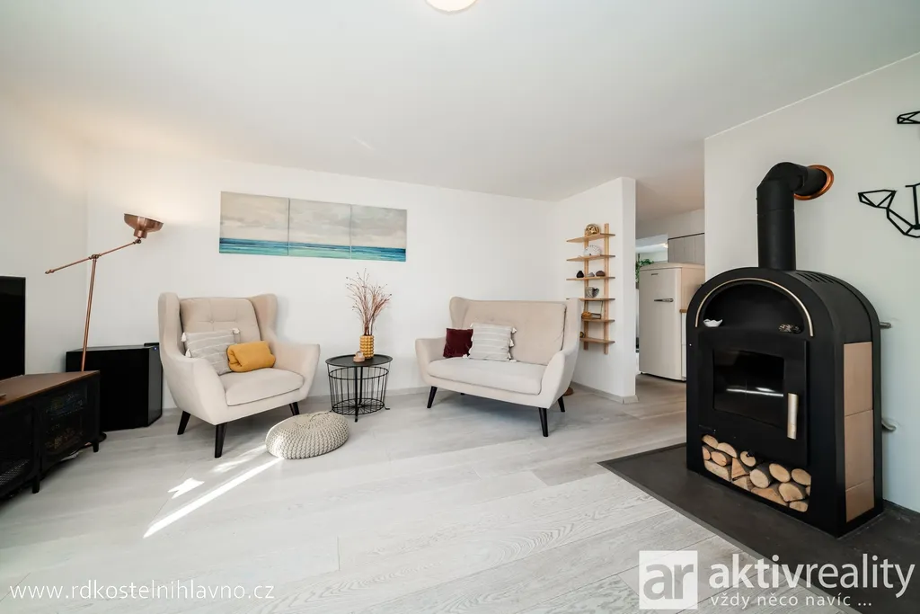 V přízemí vás přivítá světlá a prostorná vstupní chodba se skrytou šatnou, která nabízí dostatek úložného prostoru. Z chodby se dostanete do hlavní obytné části – kuchyně, která je vybavena vestavěnými spotřebiči a prakticky oddělena od obývacího pokoje komínem s krbem. Dále je zde ložnice a další pokoj, který lze využít například jako dětský nebo pracovní. Koupelna je laděná do moderního stylu, s designovou betonovou stěrkou, která je téměř bezúdržbová, a vedle ní se nachází samostatná toaleta.