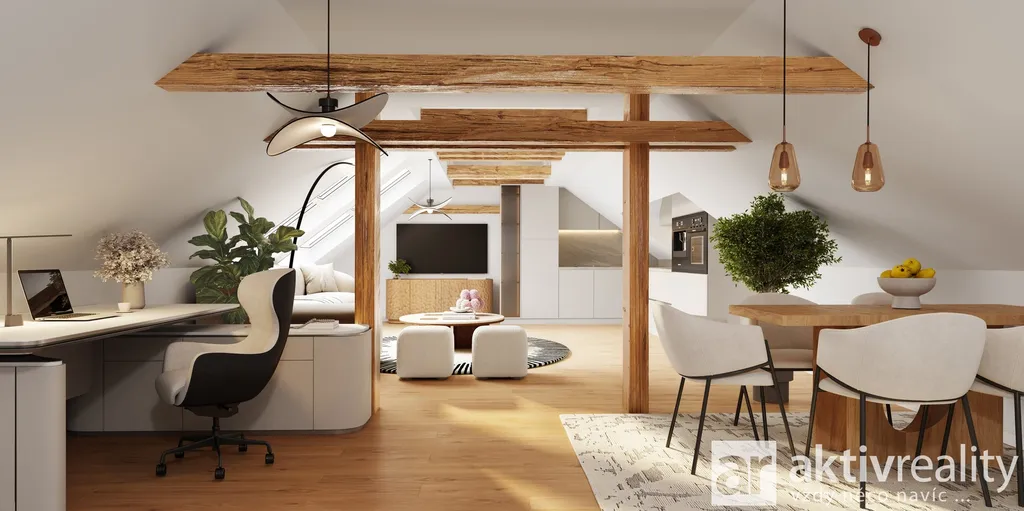 Do podkroví, které bylo vestavěno v lednu 2024, vejdete venkovním schodištěm ze zahrady. Tento prostor je připraven na dokončení samostatné bytové jednotky 2+kk cca 73 m2. Je zde prostor pro koupelnu se sprchovým koutem a toaletou, dále pak pro ložnici a obývací pokoj, který může být moderně propojen s kuchyní.