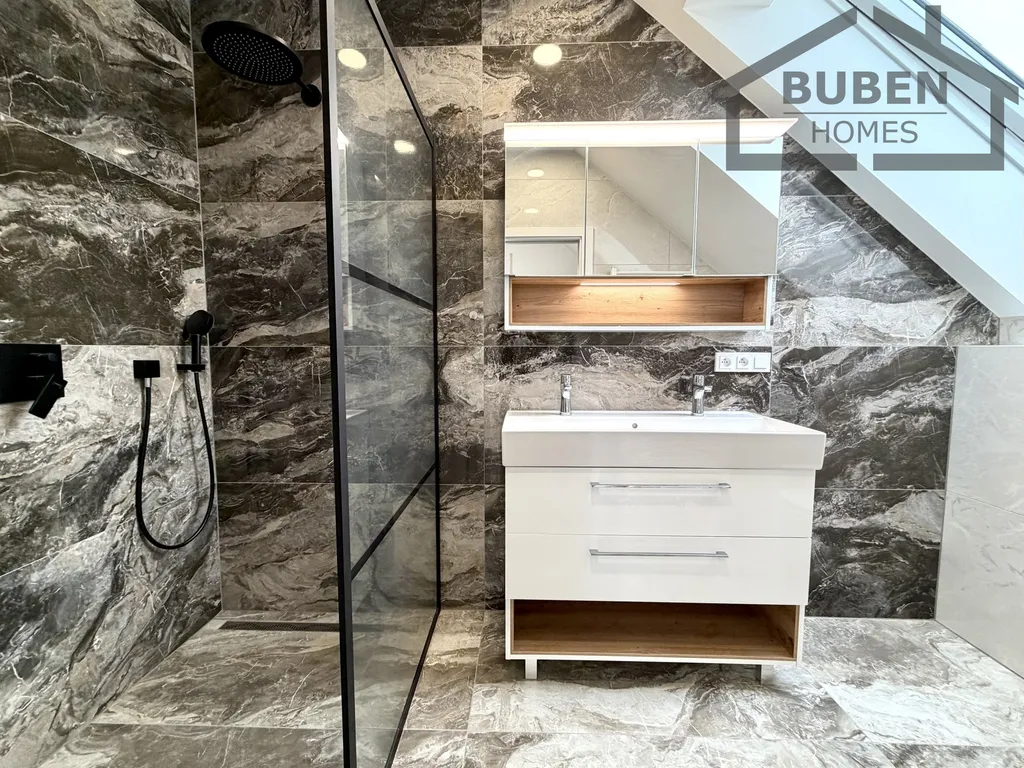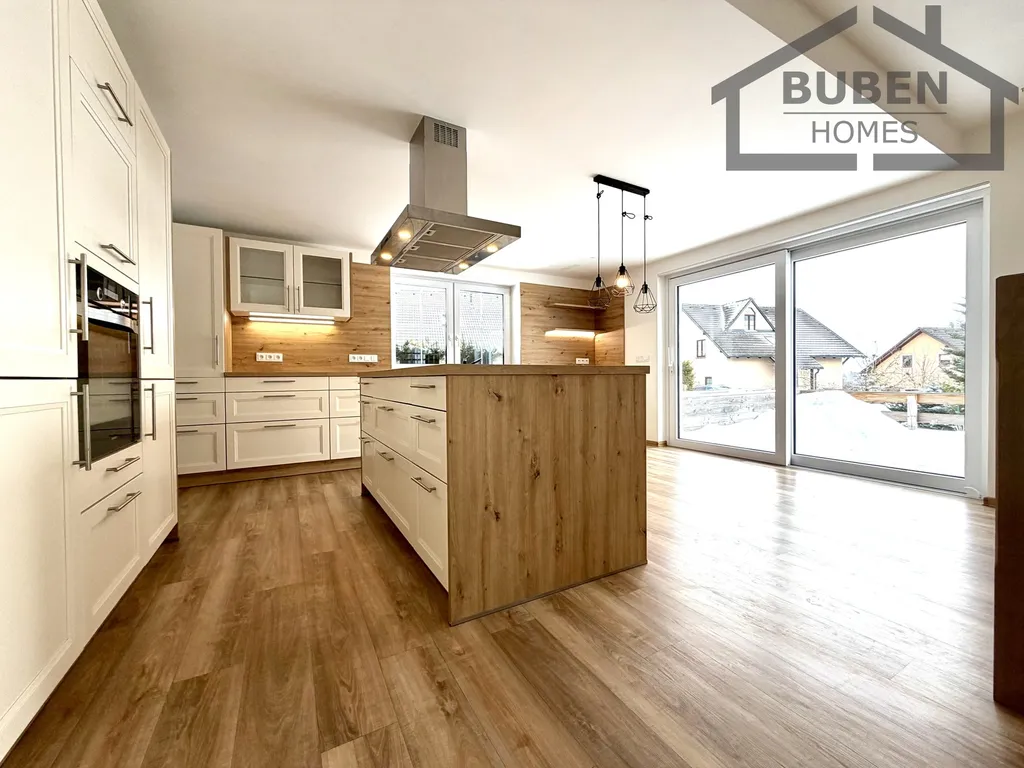 Dům se pronajímá včetně kvalitní kuchyňské linky s vestavěnými spotřebiči (horkovzdušná trouba, digestoř, sklokeramická varná deska, myčka, lednice).