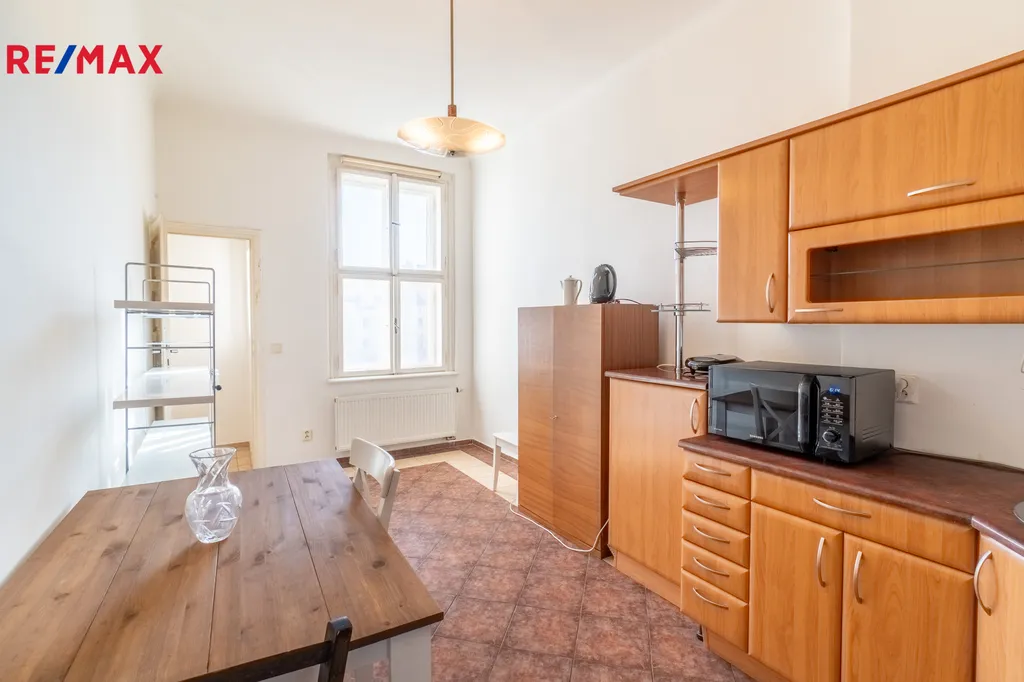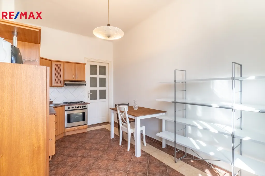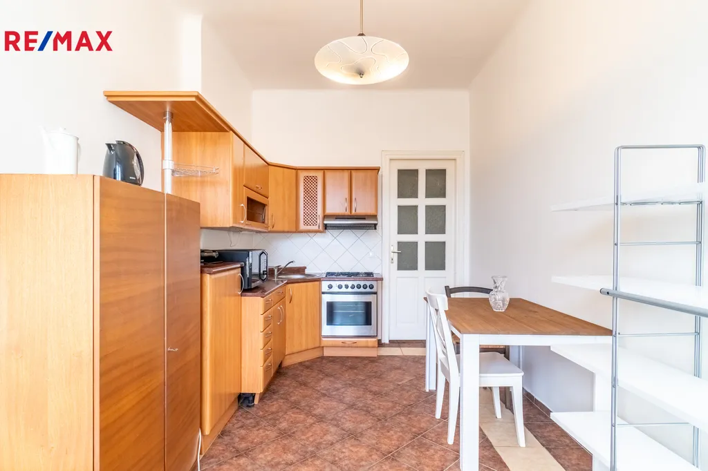 Samostatná kuchyň je vybavena jídelním stolem se dvěma židlemi, kuchyňskou linkou s mikrovlnnou troubou, toustovačem, varnou konvicí a dostatkem úložných skříněk. Sporák je plynový. Okna z kuchyně směřují do klidného vnitrobloku, což zaručuje příjemné a nerušené prostředí.