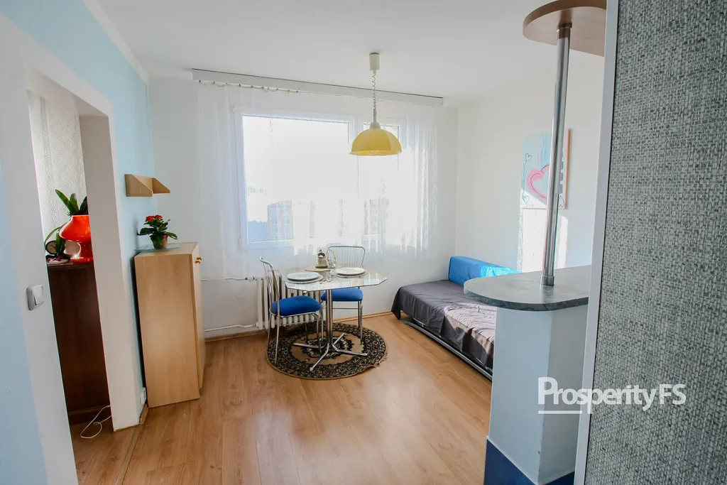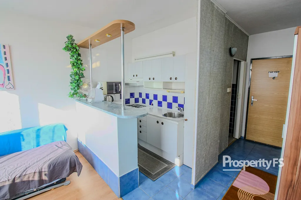 Byt nabízí praktické bydlení pro jednotlivce nebo pár. Dispozici tvoří samostatná kuchyň, obytný pokoj a koupelna s toaletou. Byt je kompletně vybavený a díky umístění v pátém patře bez okolních budov nabízí ničím nerušený výhled do okolí.