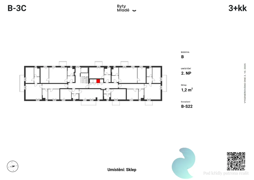 Nabízený byt č. B-3C o dispozici 3+kk, výměře 79,1 m2 a dvěma balkony 7,2 m2 a 6,5 m2, se nachází ve druhém patře budovy B. Disponuje vstupní chodbou, koupelnou, obývacím pokojem s kuchyňským koutem, dvěma neprůchozími pokoji, samostatnou toaletou a šatnou.