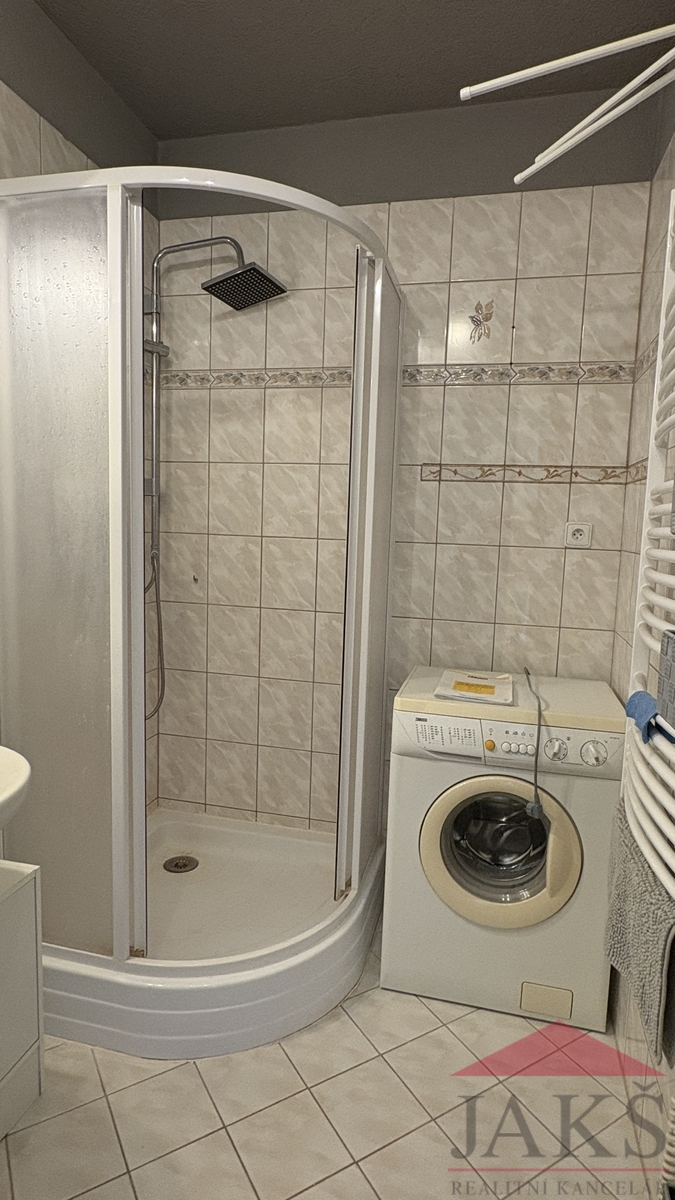 Popis: chodba, šatna s regály, zděná koupelna (sprchový kout, umyv. se zrcadlem a skříňkou, topný žebřík, pračka), samostatné WC, kuchyň (kuch. linka s plynovým sporákem s HV troubou, MV trouba, digestoř, myčka, spíží) s jídelnou (stůl se 4 židlemi), prostorný obývací pokoj (obývací stěna s TV, sedací souprava s konferenčním stolem).