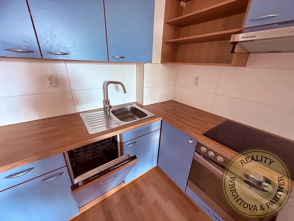 • Moderní kuchyňská linka se zabudovanou myčkou, varnou deskou a troubou.