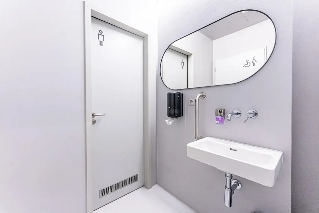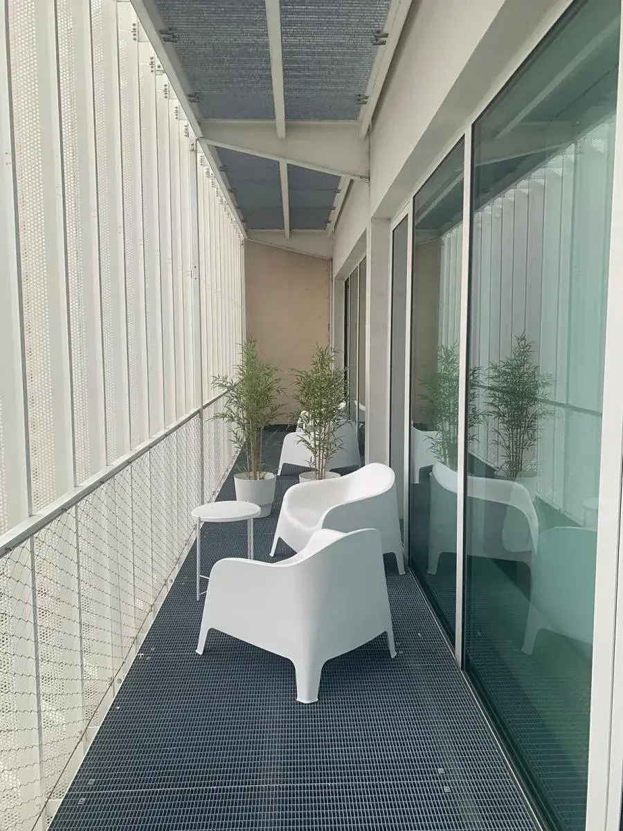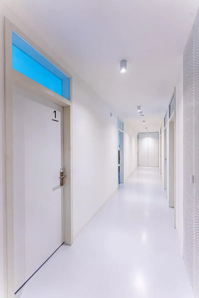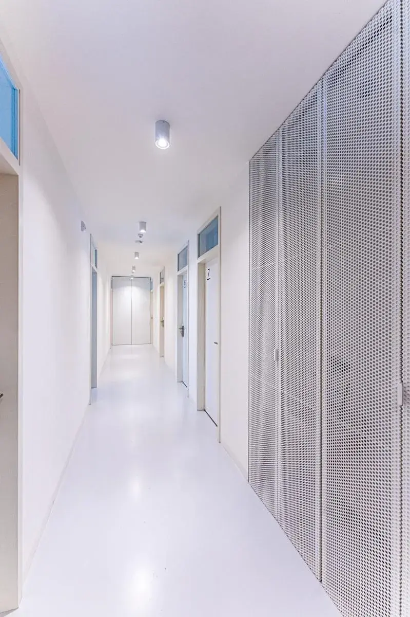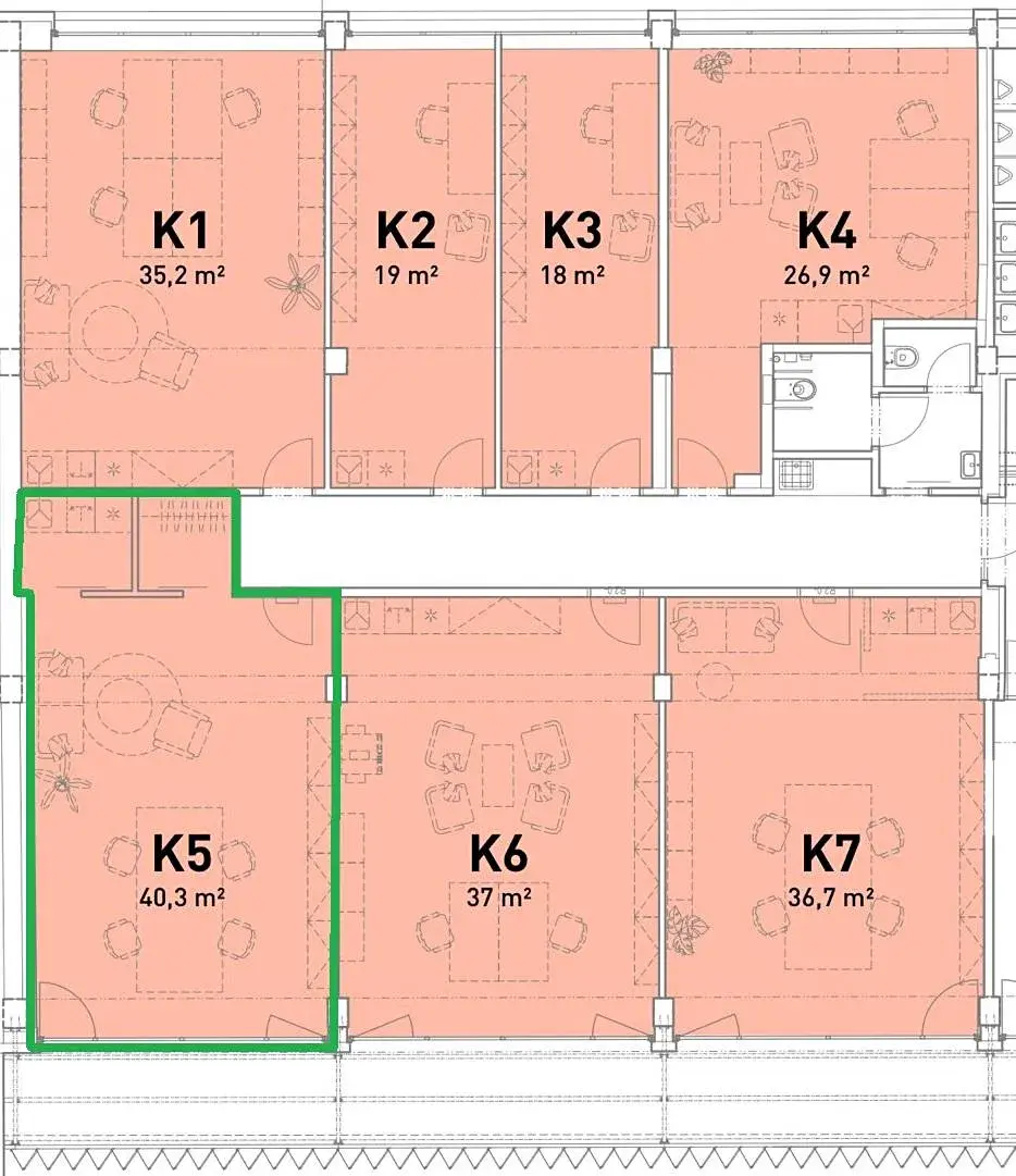 Kancelář je klimatizovaná a orientovaná na jihovýchod, což zajišťuje dostatečný přísun světla po celý rok. Celá jižní stěna je navíc prosklená, a zvenku lemovaná balkonem, který je přístupný a je součástí kanceláře. K dispozici je kuchyňka a sklad.
