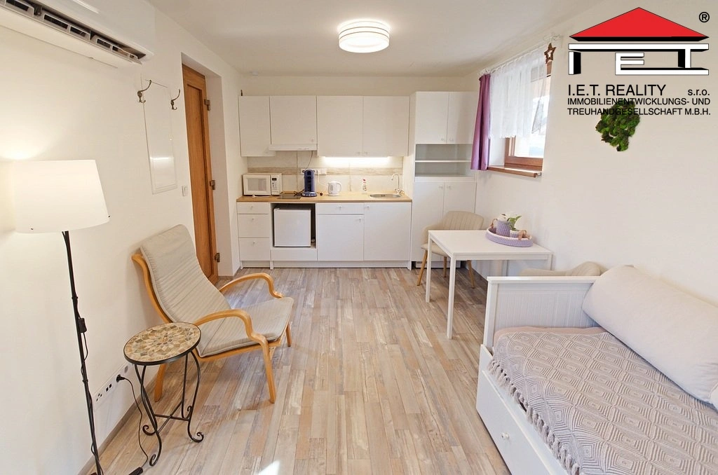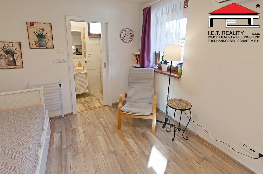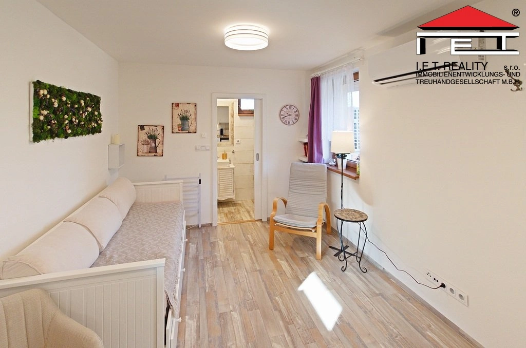 Pro pracovní využití je zde stůl se dvěma židlemi, podložka pod notebook, dále rozkládací dvojlůžko, křesílko, malý stolek a stojací lampa. Prostor má vlastní sociální zařízení s umyvadlem, WC a sprchou. Dům je zateplená novostavba stará přibližně dva roky. Vytápění je řešeno klimatizační jednotkou. V koupelně je podlahové topení. V létě je zde příjemně i bez zapnuté klimatizace.