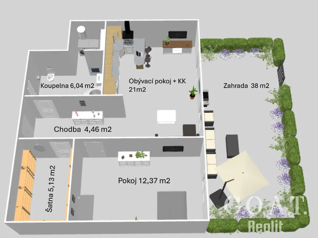 Na byt navazuje vlastní zahrada orientovaná na slunnou stranu, která je ideální pro odpočinek, posezení nebo grilování.