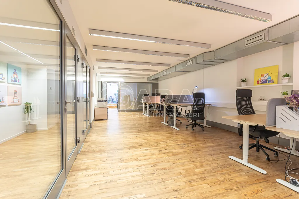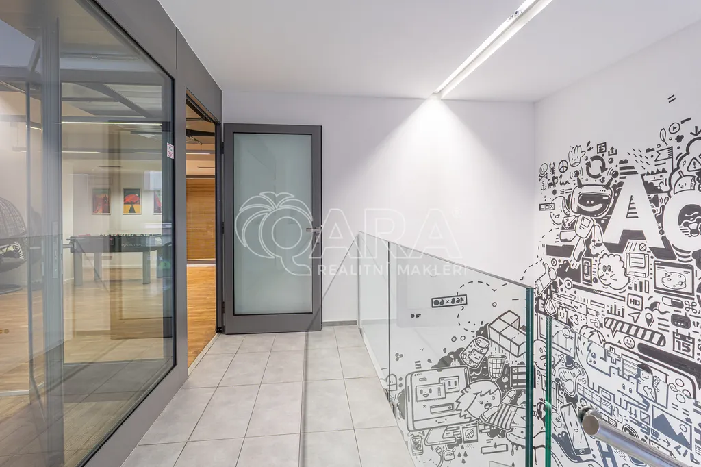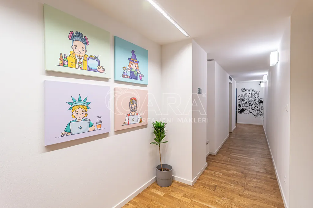 Prostor o celkové rozloze kanceláří 335 m² je klimatizovaný. Dispozice nabízí dvě větší otevřené místnosti, dvě místnosti oddělené skleněnou stěnou, přičemž jedna z nich má vstup na terasu o velikosti 17 m², samostatnou uzavřenou místnost, zasedací místnost a prostor pro recepci či posezení návštěv. Zázemí zahrnuje kuchyňku, jídelní kout, 2x moderní sociální zařízení se sprchou, serverovnu a úklidovou místnost.