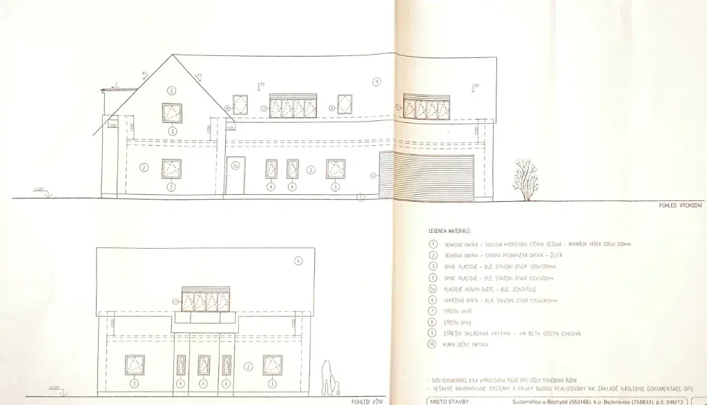 Obvodové zdivo je ytong 45 cm, vnitřní nosné zdivo ytong 25. Stropy jsou z litého betonu s armaturou. Střešní krytina betonová KM Beta černé barvy. Okna a dveře jsou plastová, garážová vrata zásuvná.