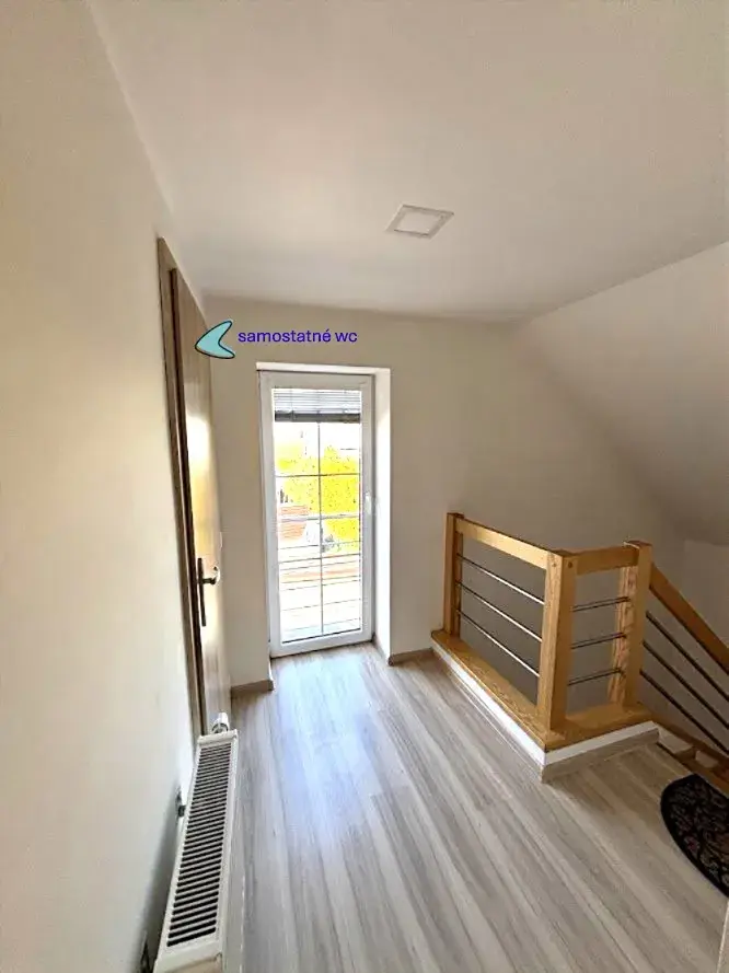 Z obývacího pokoje vede schodiště do dalšího samostatného pokoje, ke kterému se prochází přes otevřenou místnost – ta může sloužit jako relaxační zóna, pracovna či herna dle vašich představ.