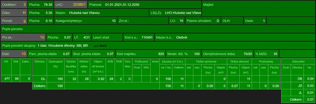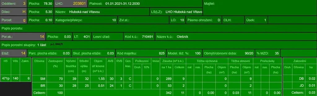 - p.č. 781/42 vedená jako lesní pozemek o celkové výměře 3 353 m2 (stáří 91 lesa let - zastoupení dřevin dub, olše, stáří lesa 40 let - zastoupení dřevin smrk),