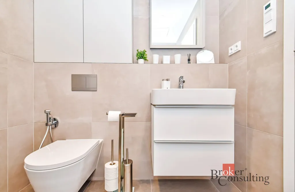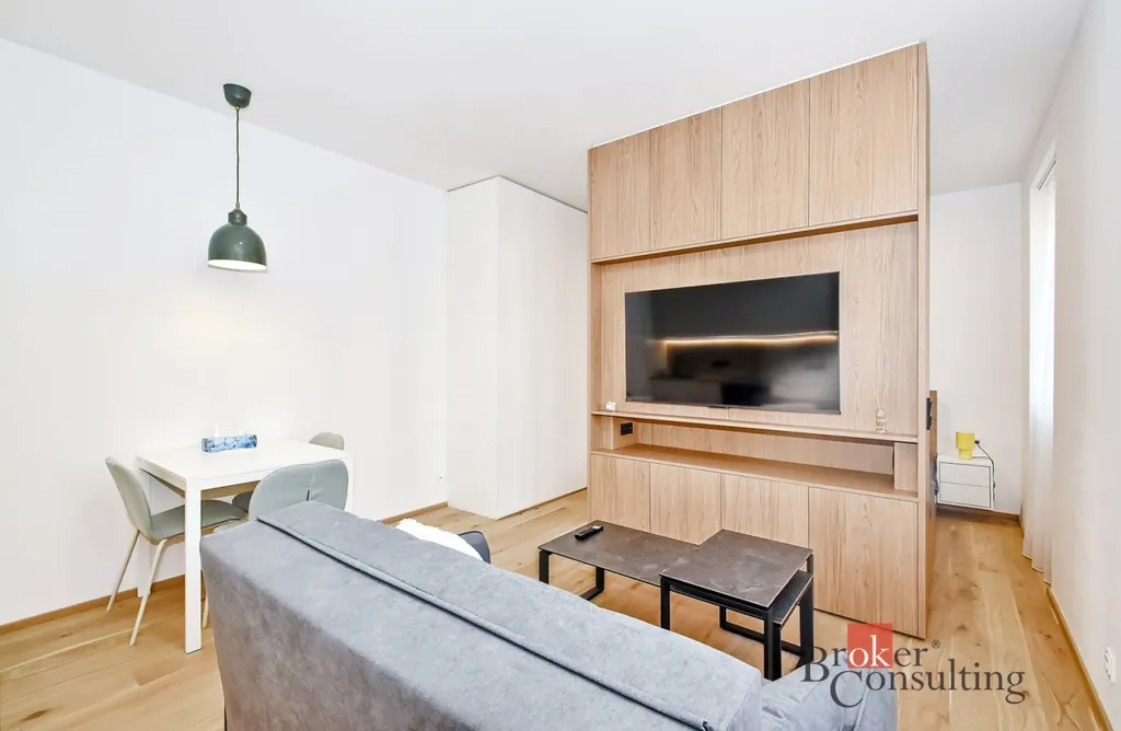 Dispozice bytu: Obývací pokoj s rozkládací sedačkou, konferenčním stolkem, obývací stěnou a TV. Za obývací stěnou se nachází šikovně oddělený spací kout s dvoulůžkem s úložnými prostory na peřiny a lůžkoviny, nočními stolky a vestavěnou skříní. Moderní kuchyň v luxusním provedení je plně vybavena – k dispozici je prostorná lednice, indukční varná deska, vestavěná digestoř, myčka nádobí, granitový dřez a jídelní stůl. Velkoryse řešená koupelna s podlahovou topnou rohoží nabízí prostorný sprchový kout, WC s bidetovou sprškou, umyvadlo, vestavěnou skříňku a pračku s integrovanou sušičkou. Předsíň je vybavena vestavěnými úložnými prostory včetně botníku. Okna jsou vybavena designovými záclonami a závěsy s blackoutovým zastíněním. Samozřejmostí jsou bezpečnostní vstupní dveře s pětibodovým zámkem. K bytové jednotce náleží také sklep.