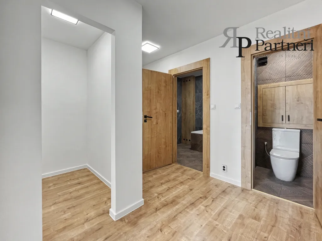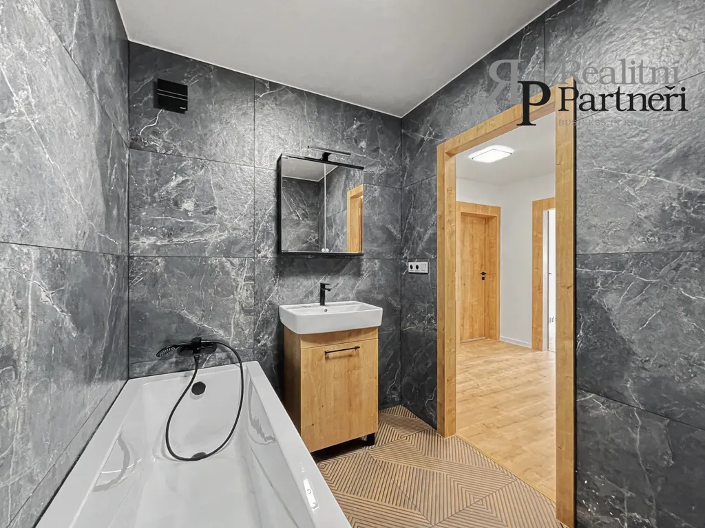 Velkou předností bytu je nově vybudované koupelnové jádro z tvárnic Ytong. Koupelna nabízí vanu, přípravu na pračku a sušičku a je dokončena novými obklady a dlažbou.