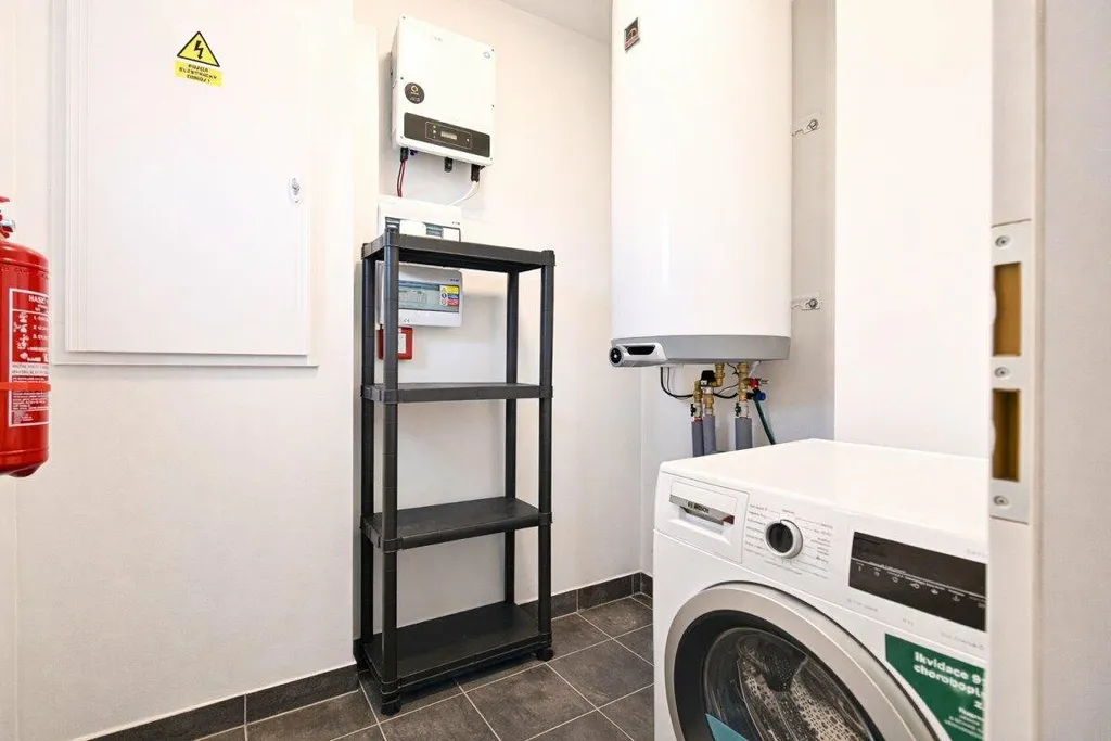 Dispozice domu dále nabízí tři samostatné ložnice, které poskytují dostatek soukromí pro všechny členy domácnosti nebo prostor pro zřízení domácí pracovny. Velmi praktickým prvkem je oddělená technická místnost s pračkou a prostorná koupelna vybavená jak vanou pro relaxaci, tak sprchovým koutem pro rychlé ranní osvěžení. Dům se nabízí kompletně vybavený nábytkem přesně tak, jak jej vidíte na fotografiích, což vám ušetří spoustu starostí se stěhováním.