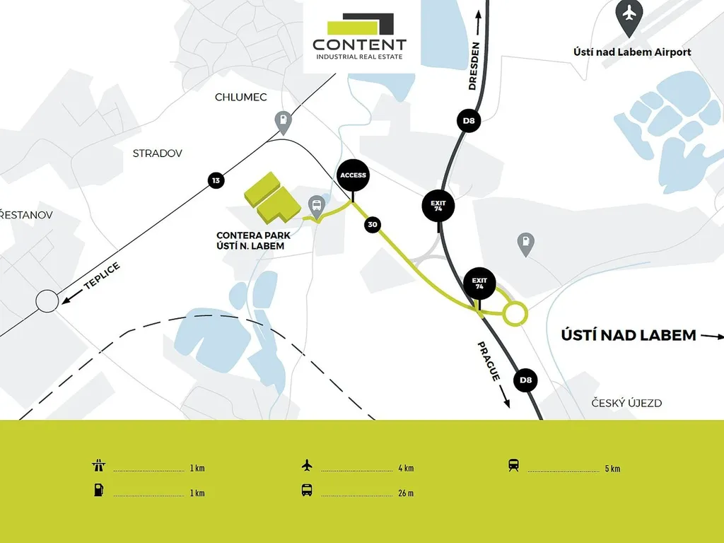 Bez provize nabízíme skladové nebo výrobní prostory v nově vznikajícím industriálním parku, s rychlým napojením na dálnici D8: