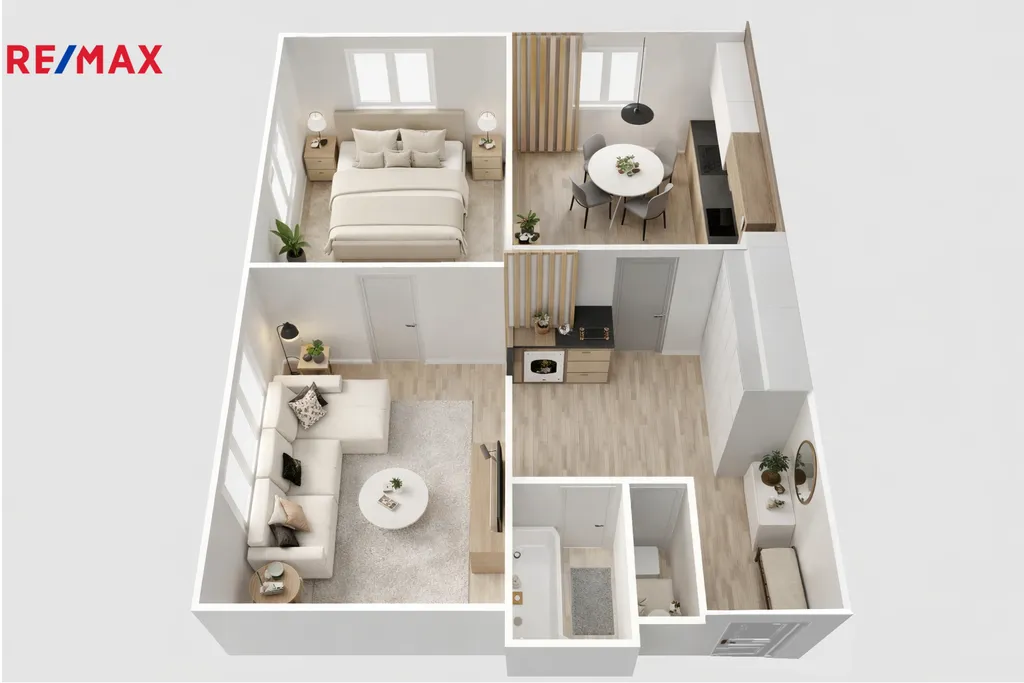 Dispozice bytu je přehledná – po vstupu se vchází do prostorné předsíně, ze které je samostatný vstup do kuchyně, koupelny, WC a hlavního pokoje. Z něj se dále prochází do druhého pokoje, který je dispozičně řešen jako navazující, ale zároveň oddělený prostor. Oba pokoje jsou vybaveny zachovalými parketovými podlahami, které dodávají interiéru charakter. Byt má celkem čtyři okna, z toho dvě orientovaná na jih a dvě na západ, díky čemuž je krásně prosvětlený po celý den. Kuchyň je dostatečně prostorná a umožňuje umístění jídelního stolu, takže může sloužit i jako plnohodnotná jídelna. K bytu náleží také sklepní kóje (4 m²).