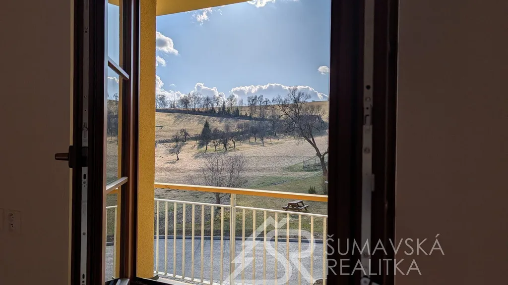 Dominantou bytu je prostorný balkon o velikosti 7,3 m² orientovaný na jihozápad, který nabízí krásný výhled na Šumavu a dostatek slunce po většinu dne. Obývací pokoj s francouzskými dveřmi na balkon plynule navazuje na kuchyňský kout umístěný v praktickém zálivu. Ložnice má vlastní okno směrem na balkon, což zajišťuje příjemnou atmosféru i dostatek světla.