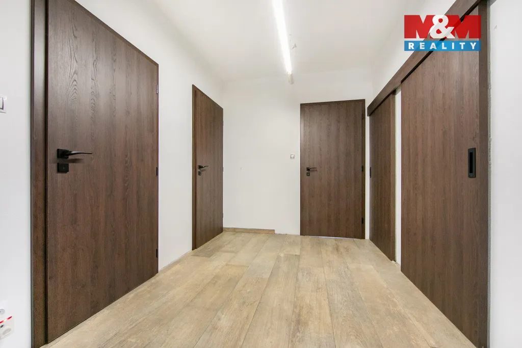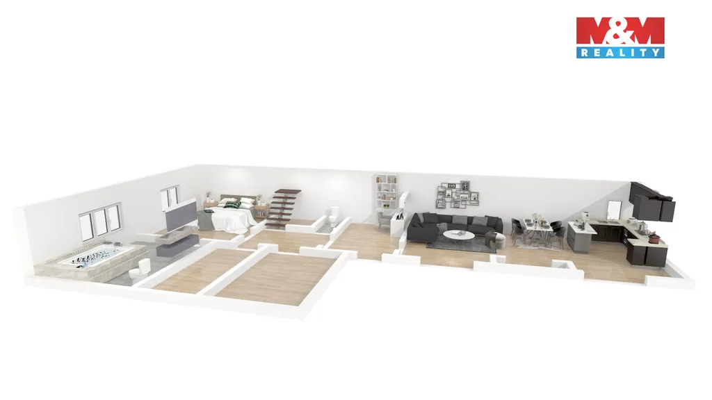 V přízemí se nachází vstupní předsíň, šatna, prostorný obývací pokoj s kuchyňským koutem a vstupem na terasu, ložnice, koupelna s masážní vanou, sprchovým koutem a WC, pracovna, technická místnost a samostatné WC. Součástí sklep a vstup na půdní prostor.