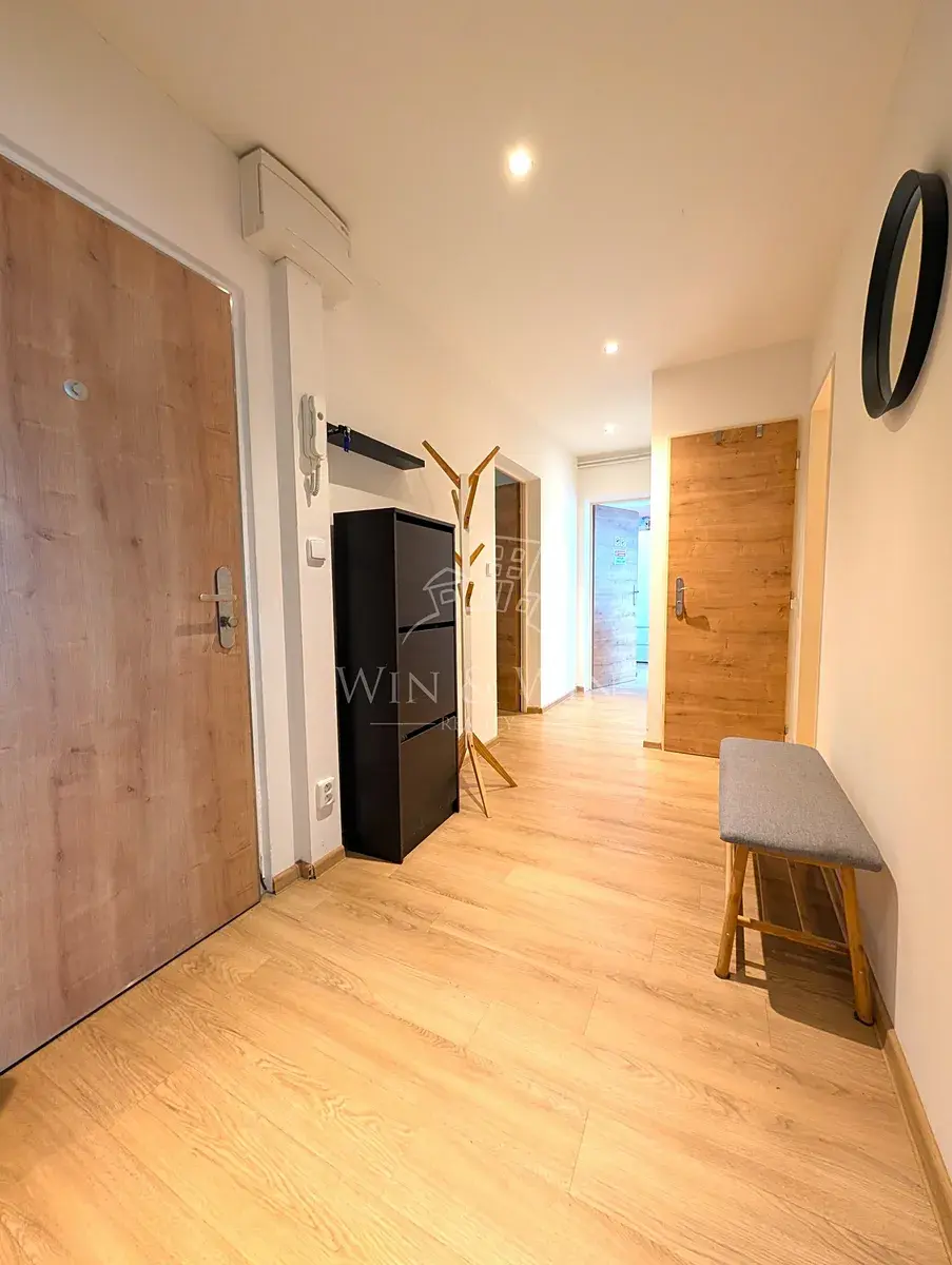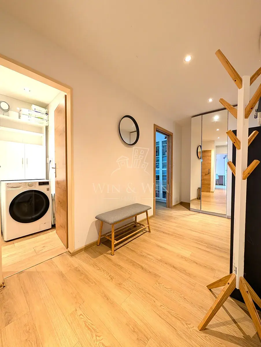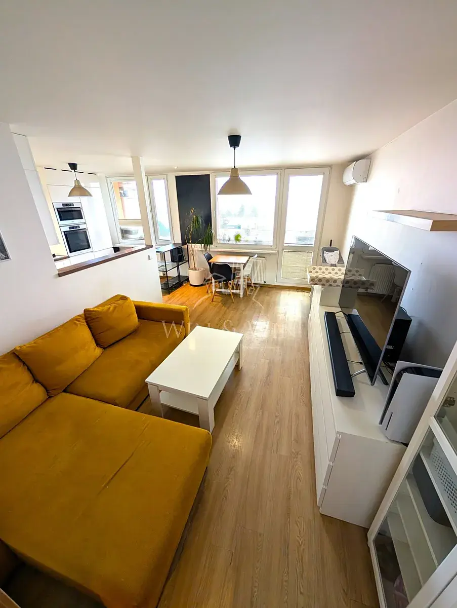 Dispozice bytu je navržena s důrazem na praktičnost. Nabízí dvě samostatné ložnice orientované do klidné části za domem, prostorný obývací pokoj propojený s moderní kuchyní a klimatizací pro maximální komfort během celého roku. Dále velkorysou předsíň, koupelnu s vanou, samostatnou toaletu, zasklenou lodžii a sklep.
