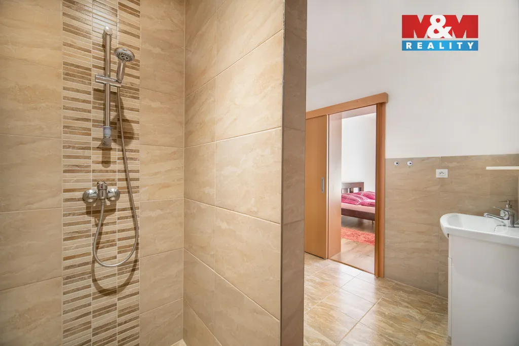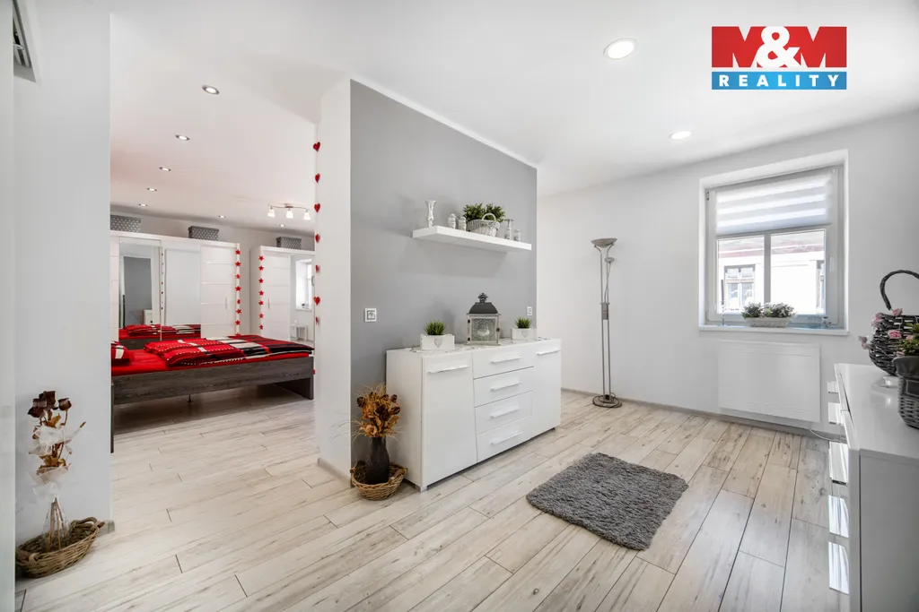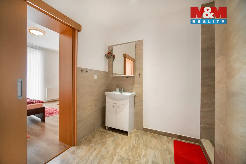 V prvním patře je situována moderní bytová jednotka s otevřeným obývacím prostorem a kuchyňským koutem, ložnicí s navazující koupelnou, samostatným WC, spíží a technickou místností.
