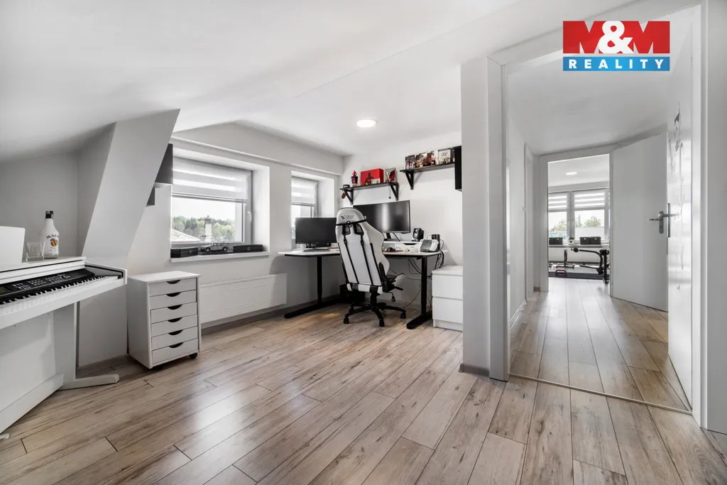 Podkroví nabízí dvě samostatné ložnice, koupelnu a praktické šatní prostory.