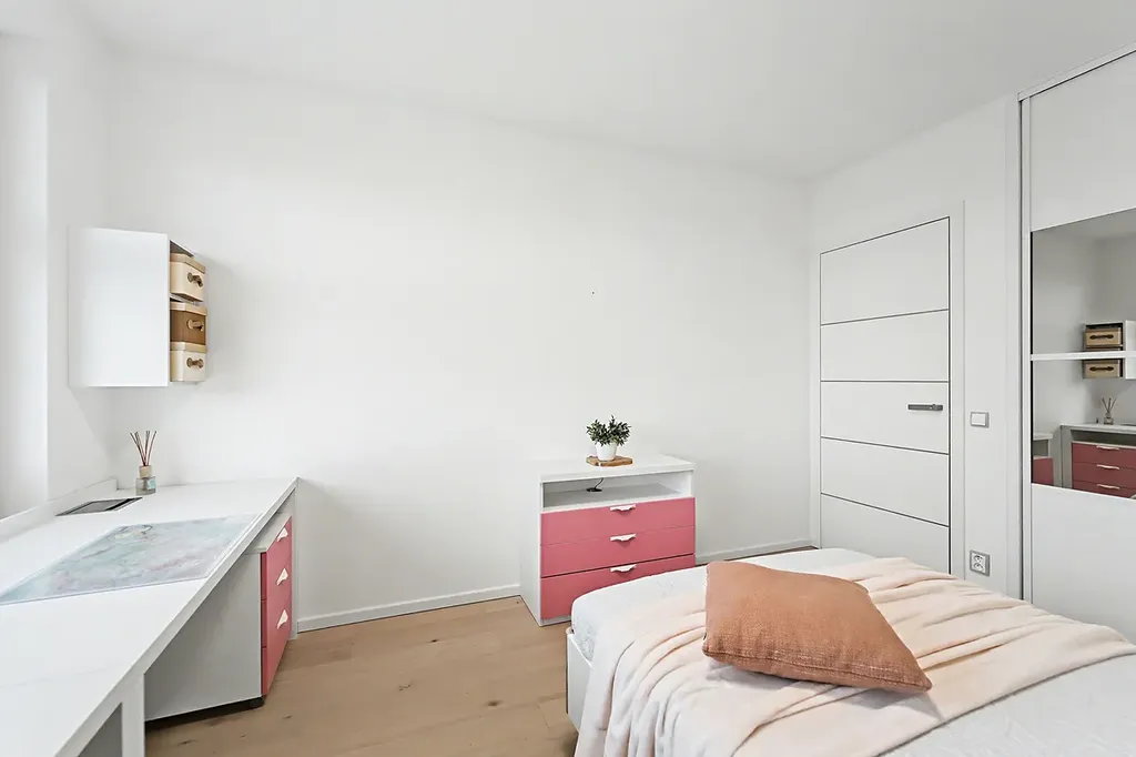 Na dětský pokoj navazuje pokoj pro hosty či pracovna (12,43 m²), rovněž orientována na jih s výhledy do zeleně, která poskytuje zázemí pro práci a klid. Samozřejmostí jsou venkovní sluneční žaluzie ve všech pokojích, které zajišťují příjemné klima i soukromí.