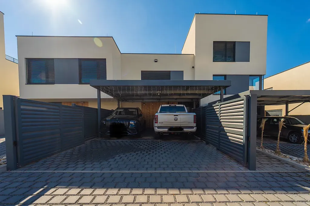Před domem dvě krytá parkovací stání, možné parkování až pro 4 auta (70 m²). Kolaudace domu listopad 2021. Dům vybaven chytrou domovní kamerou video vrátný a bezpečnostním systémem Jablotron.