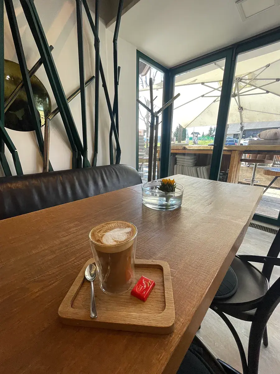 Kavárna o ploše 44 m² byla navržena akademickým architektem Jaroslavem Šustou Jr. a patří mezi oblíbená místa setkávání turistů i místních. Dominantou interiéru je bar z blatenské žuly a obložení z hluboce drásaného dubu. Prostor doplňuje stylový salonek s kachlovými kamny a unikátním obložením stěn z březové kořenovice. Kavárna nabízí přibližně 20 míst k sezení uvnitř a dalších až 30 míst na prostorné venkovní terase, která je vydlážděna historickou žulovou dlažbou ze zámečku v Jeseníku. Celková kapacita kavárny tak dosahuje přibližně 50 míst a terasa je ideální i pro pořádání menších akcí či oslav.