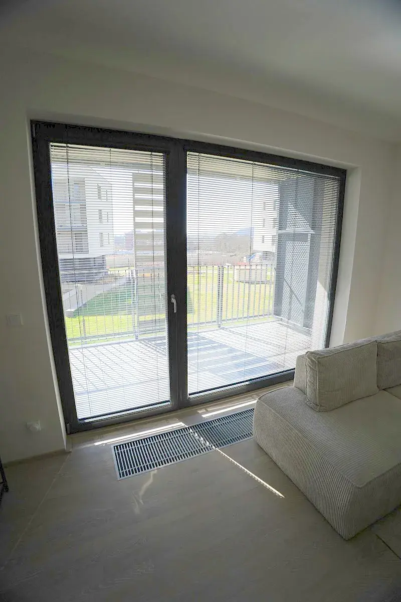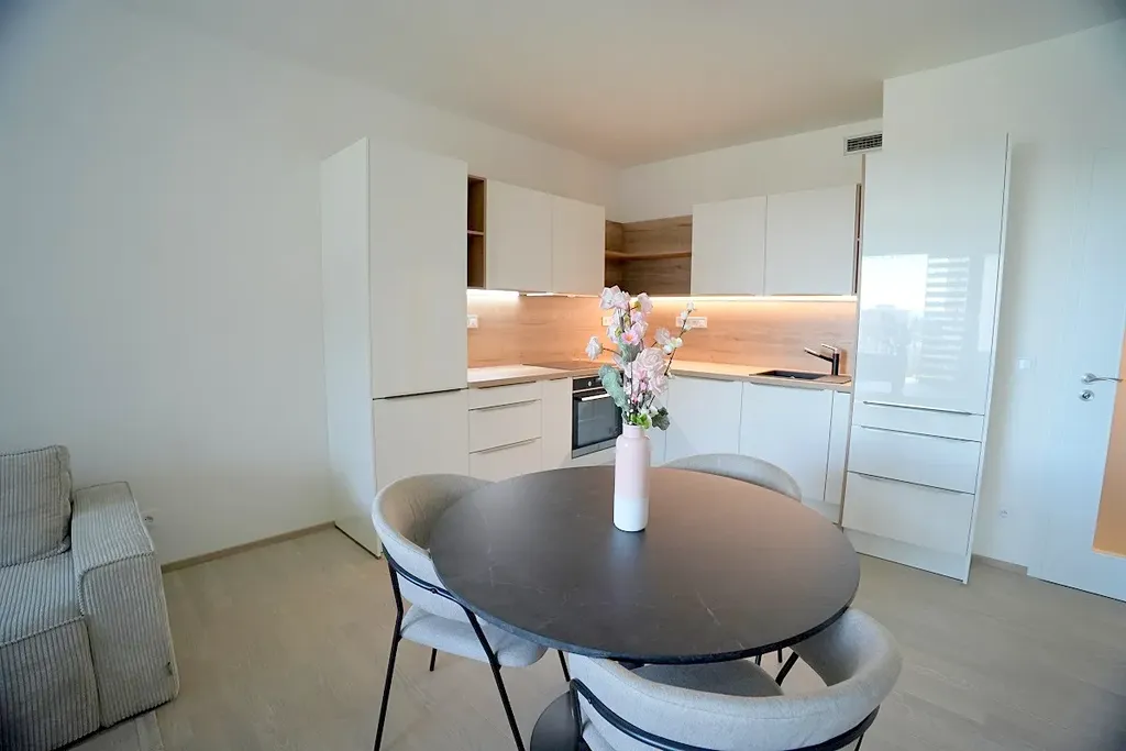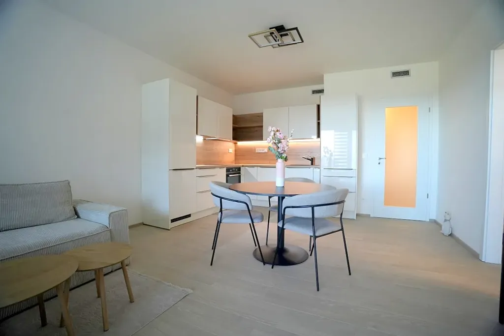 Atraktivní nabídka pronájmu zcela nového moderního částečně zařízeného bytu 2+kk/balkon/sklep (celkem 70 m2) včetně garážového stání, Praha 4 - Modřany, ul. Mezi Vodami. Příjemný a slunný byt je součástí nové výstavby bytového projektu "Zahálka", který vyrostl na klidném místě v pražské čtvrti Modřany v blízkosti řeky Vltavy. Součástí vkusně zařízeného bytu o ploše 60 m2 s balkonem o ploše 7,5 m2 je prostorný obývací pokoj s kuchyňským koutem (27,5 m2) a výstupem na balkon, ložnice (16 m2), předsíň (4,5 m2) a koupelna s vanou, umyvadlem a toaletou (7 m2). K dispozici je jedno garážové stání (další parkovací stání k pronájmu je možné zajistit) a zděná sklepní koje (3 m2) v suterénu domu. Kuchyňská linka je vybavená veškerými spotřebiči (el. trouba, indukční varná deska, odsavač par, lednice s mrazákem). Byt se nachází v regulérním 1. patře a je vybavený, jak je uvedeno na fotografiích – vyjma postele. Okna i balkon jsou orientovány na západ. Součástí bytového areálu jsou kavárny, supermarket, fitness centrum a další služby. V docházkové vzdálenosti je stanice tramvají směr centrum Prahy a dále autobusové spojení k metru trasy B – Smíchovské nádraží. Sportovní nadšenci ocení přilehlou cyklostezku směr Výtoň a Zbraslav. Složená jistota činí 70 000 Kč. Budoucí nájemce neplatí provizi. PENB A.