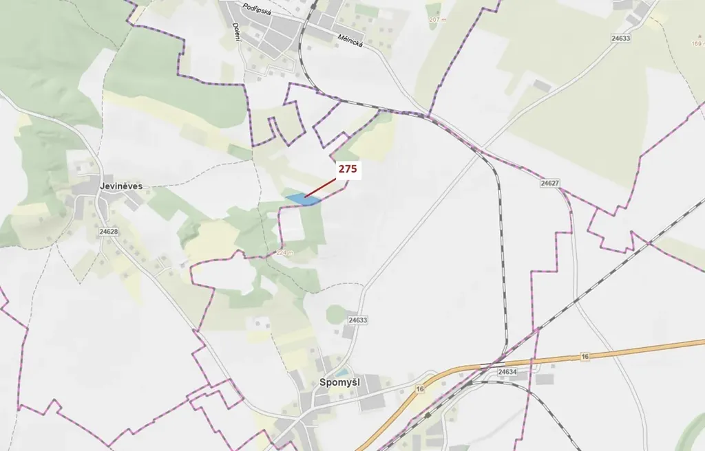 Lesní pozemek o výměře 10 319 m2, parcelní číslo 275, podíl 1/1, katastrální území Jeviněves, obec Jeviněves, obec s rozšířenou působností Mělník, okres Mělník, Středočeský kraj. Po těžbě.