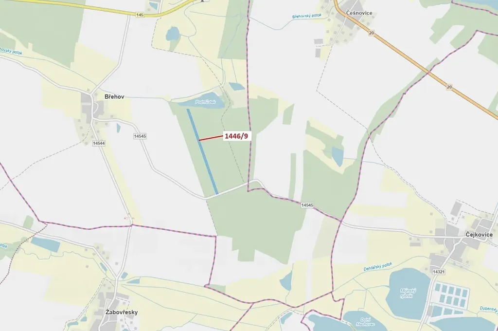 Lesní pozemek o výměře 19 879 m2, parcelní číslo 1446/9, podíl 1/1, katastrální území Břehov, obec Břehov, obec s rozšířenou působností České Budějovice, okres České Budějovice, Jihočeský kraj. Po těžbě.