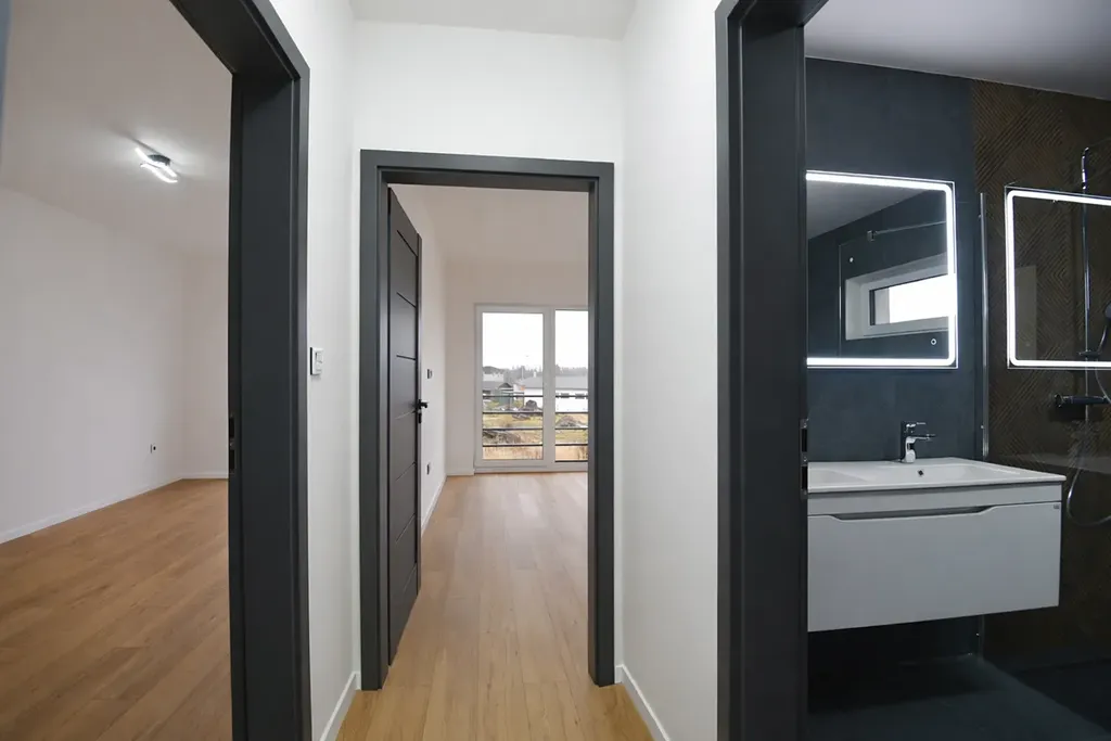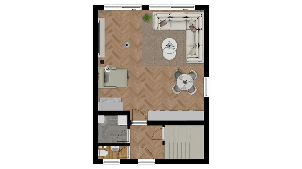 Jednotka disponuje podlahovou plochou 106 m2. V 1 NP se nachází velký obývací pokoj s kuchyňským koutem o výměře 41 m2, vstupní hala, technická místnost, toaleta s umyvadlem a šatna pod schodištěm. Kuchyně s vestavěnými spotřebiči zn. Candy je součástí prodeje. Obývací pokoj je prosvětlen velkými francouzskými okny a v jeho rohu je připravený komín na instalaci krbových kamen. V technické místnosti je umístěn centrální kotel a připravený přívod vody a odpad pro pračku se sušičkou.